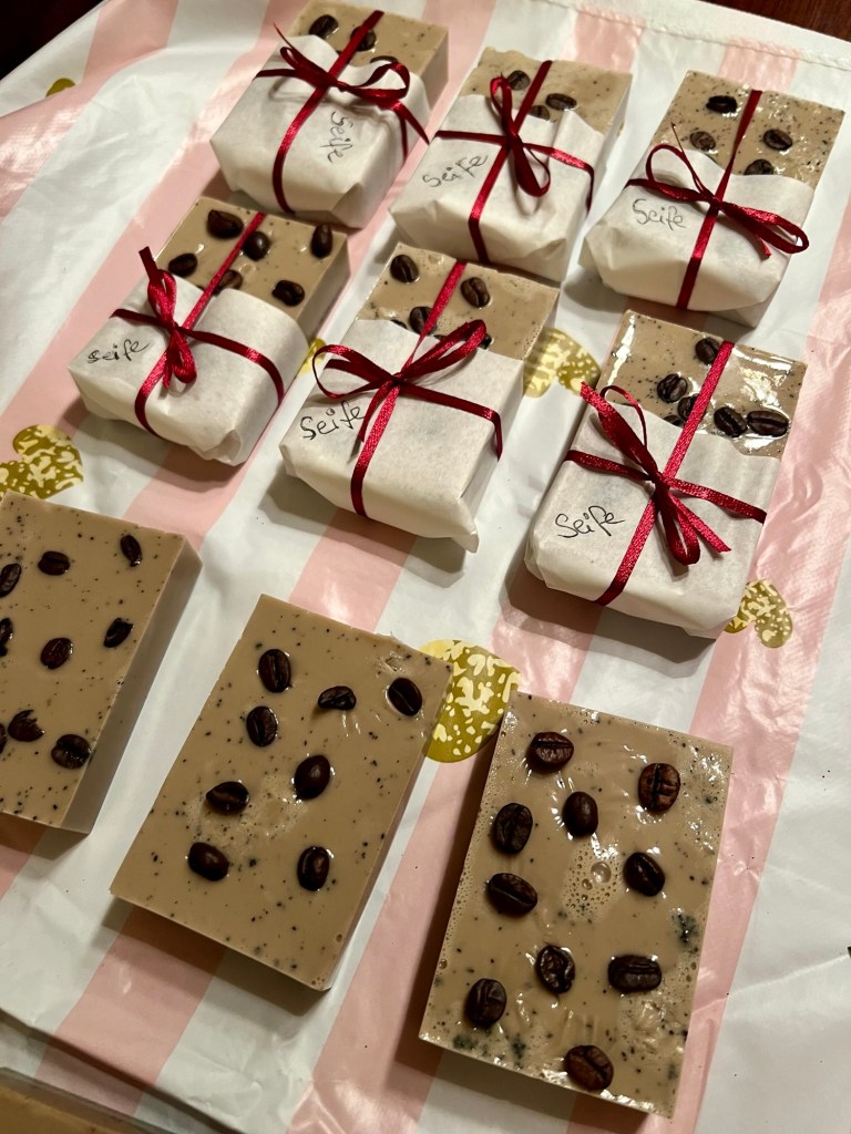 Dann hatte ich noch eine tolle Idee auf Pinterest entdeckt. Kaffeeseife mit Peelingeffekt. Dafür habe ich Kaffeesatz gesammelt und getrocknet. Dann benötigt man einfach nur noch Seifenbasis (gibt es bei Amazon), Kaffee – Seifenduft, Silikonform je nach Geschmack und Kaffeebohnen für die Verzierung.