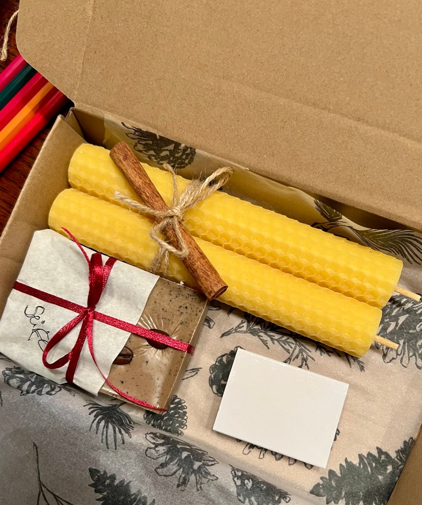 Ich verschenke ja immer gerne was selbst gemachtes und dieses Jahr habe ich Bienenwachsplatten für mich entdeckt. Damit kann man ganz einfach und schnell Kerzen in einer schönen Optik basteln.