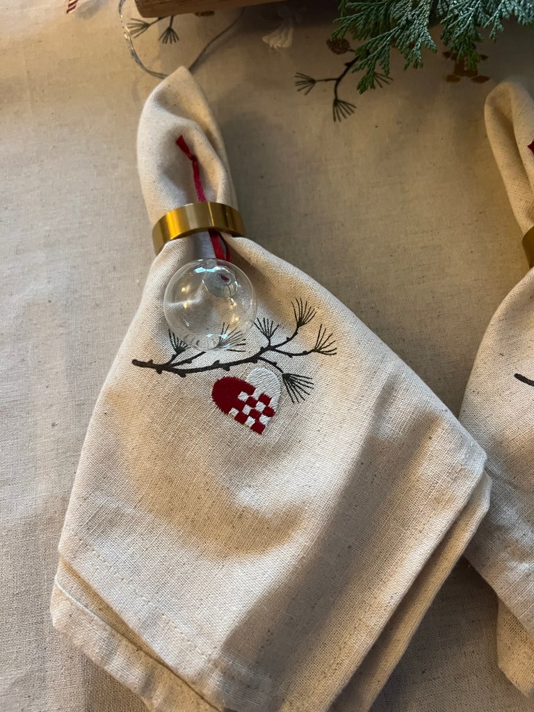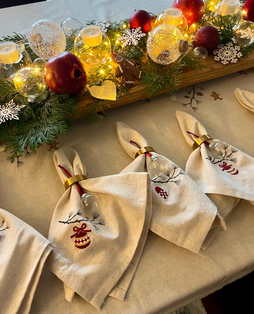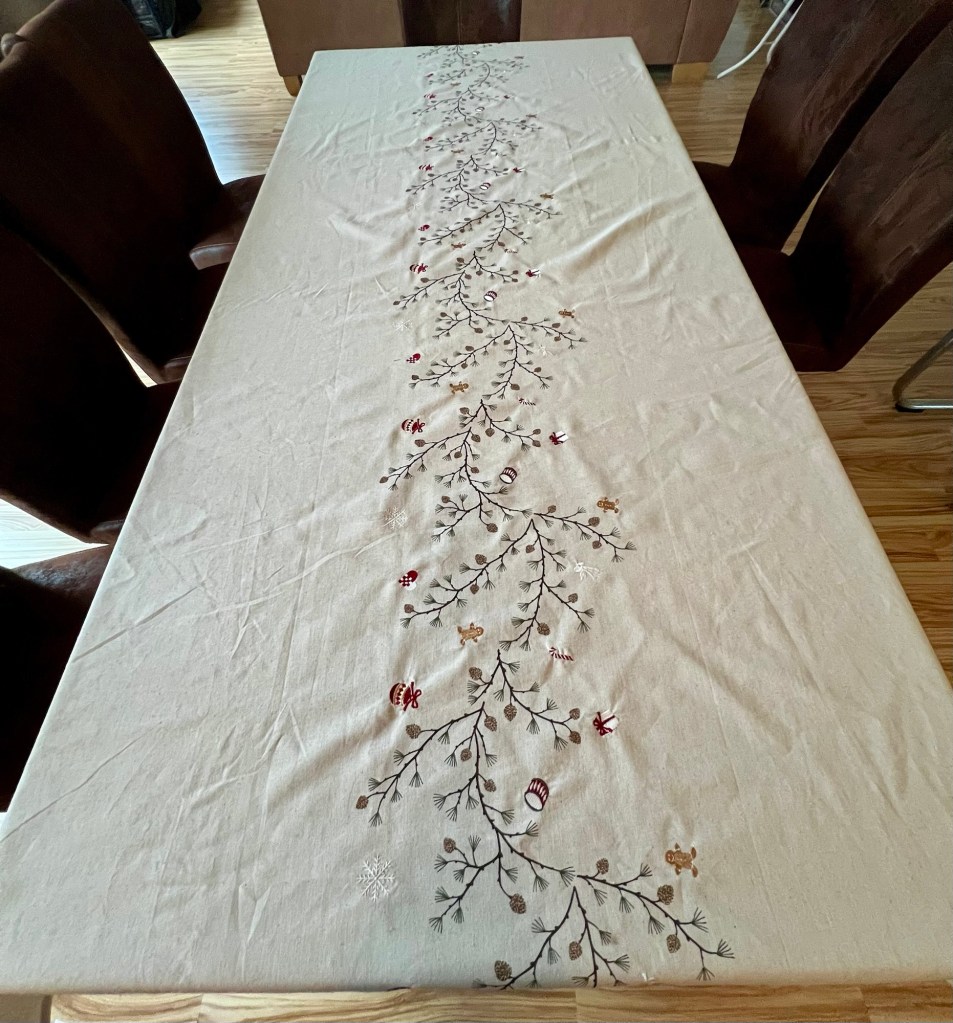 Ich habe bei Jysk eine wunderschöne Tischdecke mit passenden Servietten gekauft. Dies hat die Grundlage meiner Tischdekoration gebildet.