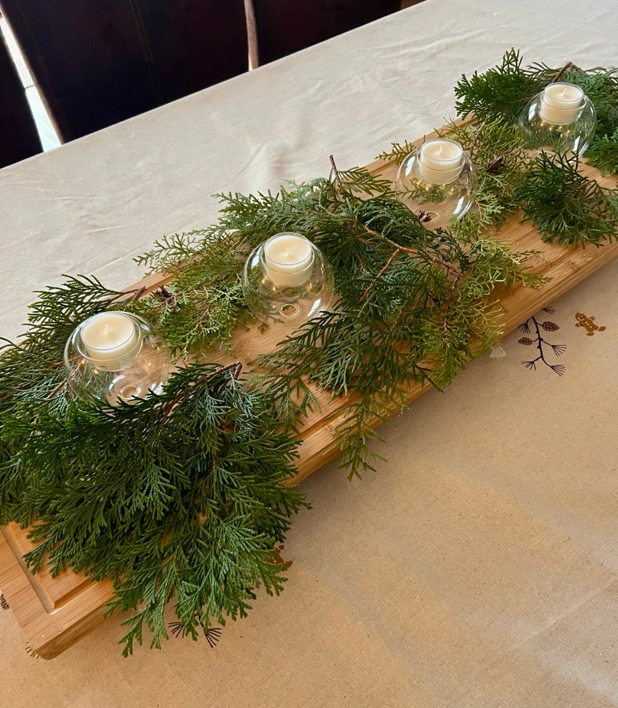Dann habe ich vier Teelichter aus Glas in Form von Weihnachtskugeln auf dem Brett arrangiert.