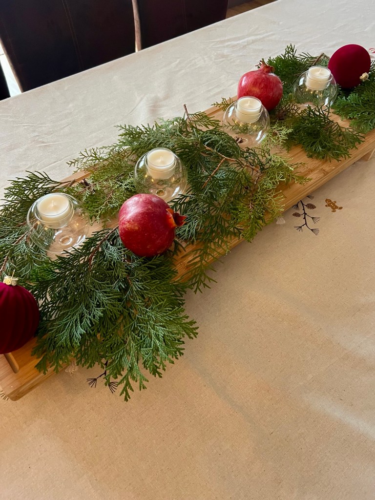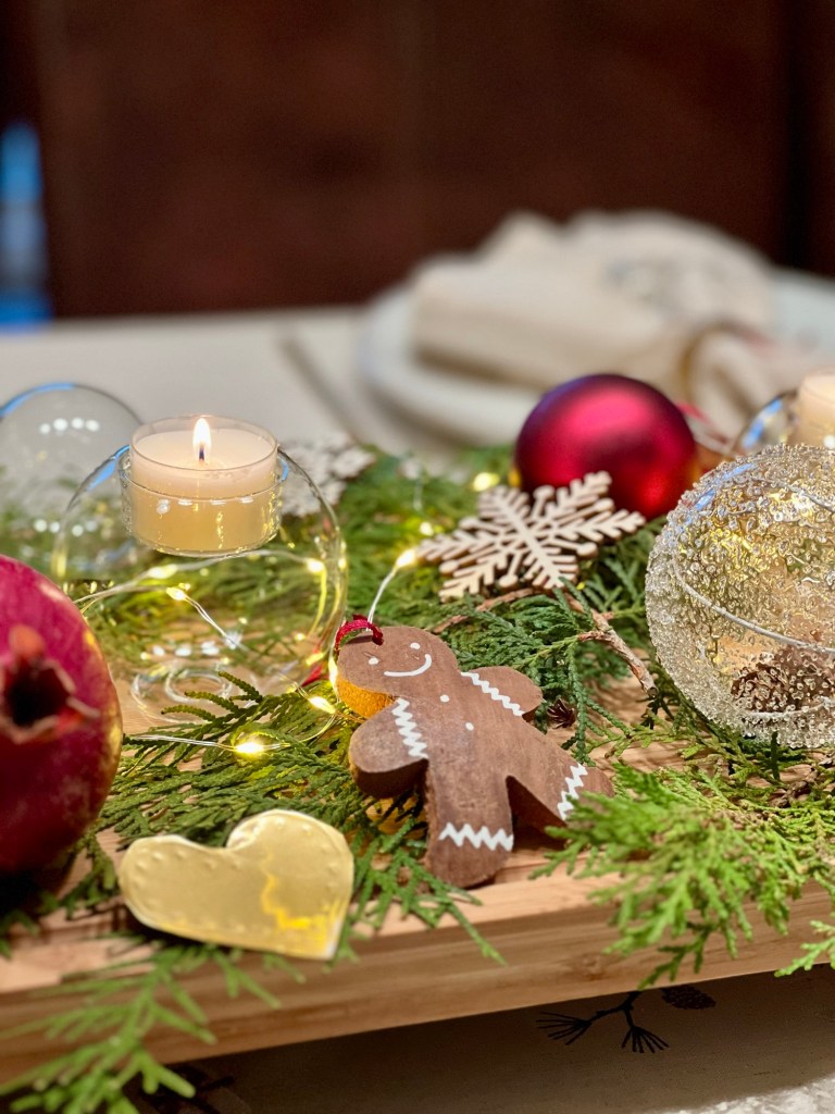Dann habe ich weitere Glaskugeln und weinrote Kugeln dazu dekoriert. Ich habe noch ein paar Holzsterne und kleine Lebkuchenmänner aus Kokosholz dazu gelegt.