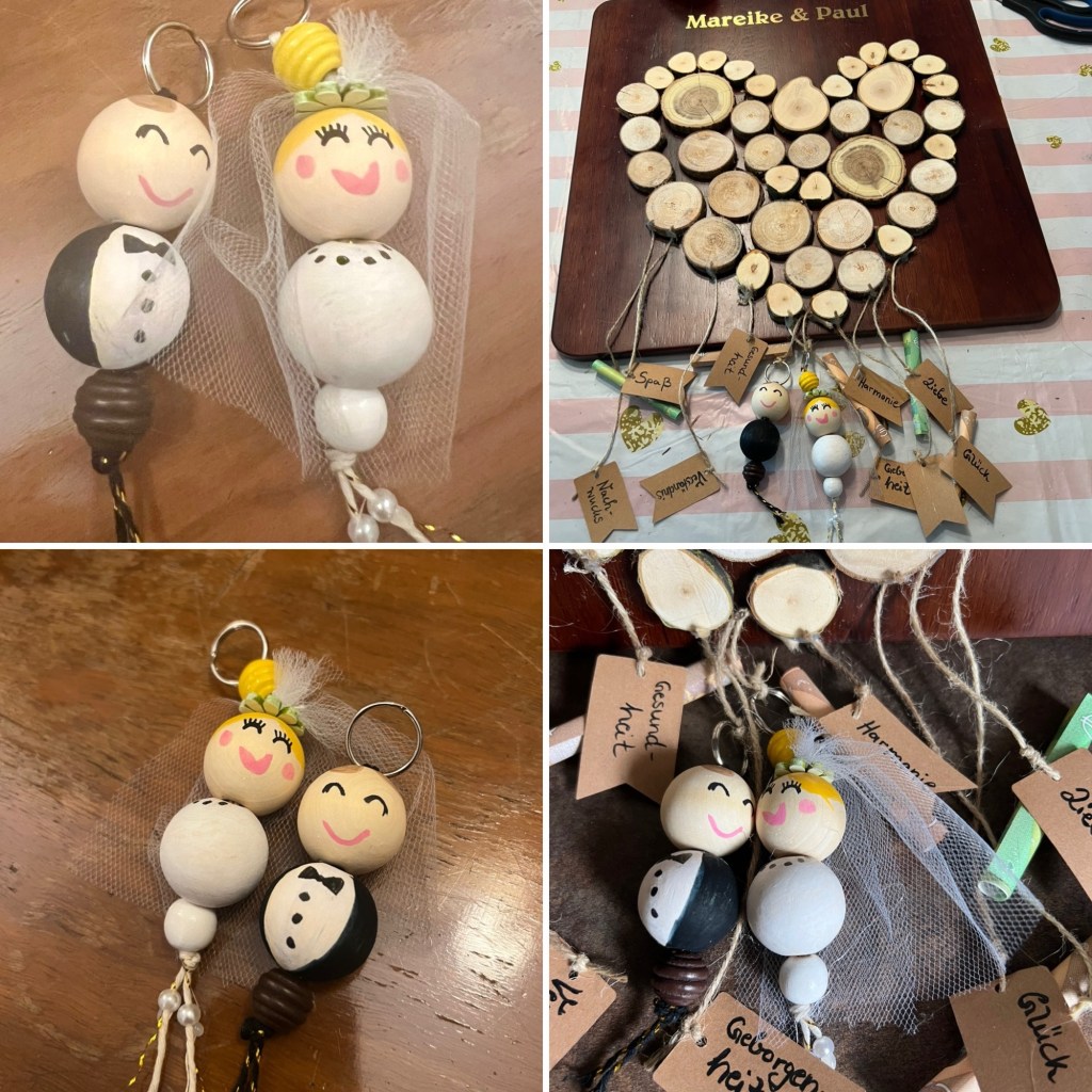 Als kleines Highlight haben wir dazu noch ein süßes Brautpaar aus Holzkugeln mit angehangen. Das hatte ich vorher bei einen schönen Bastelabend mit meinen Mädels gebastelt.