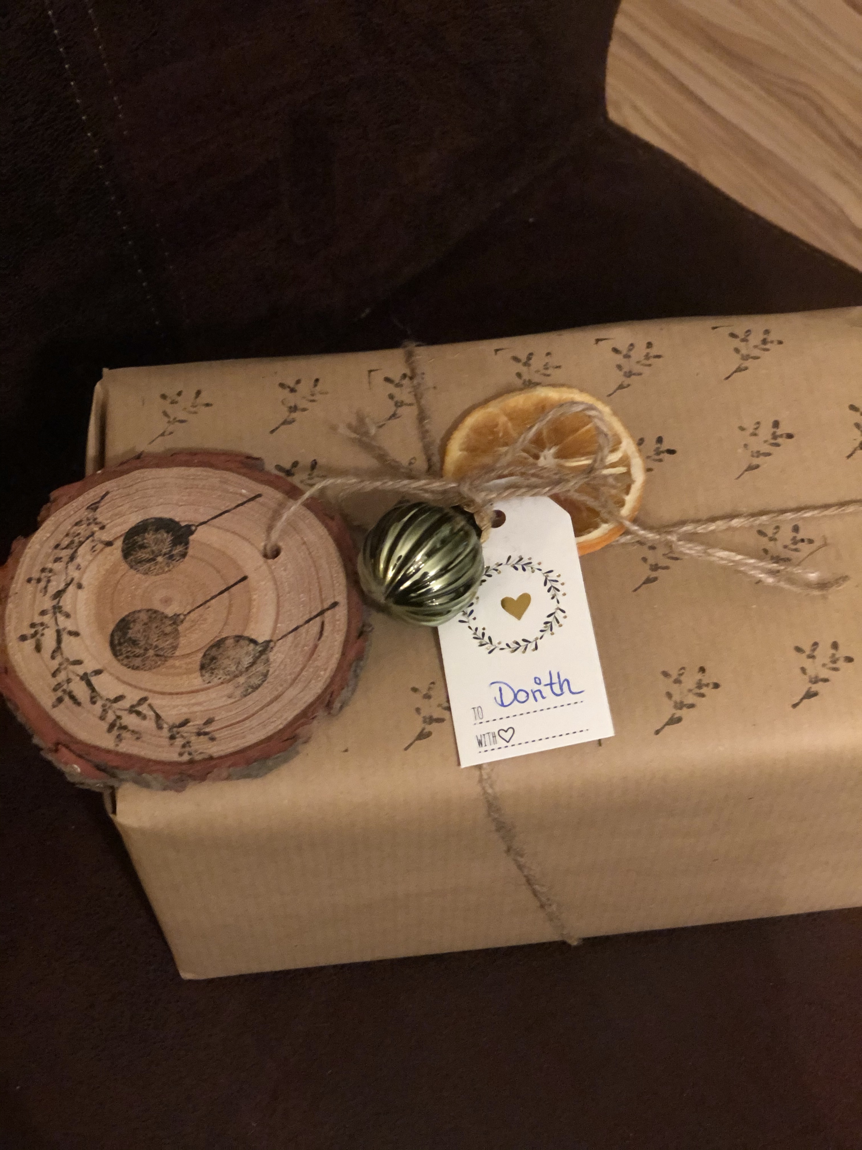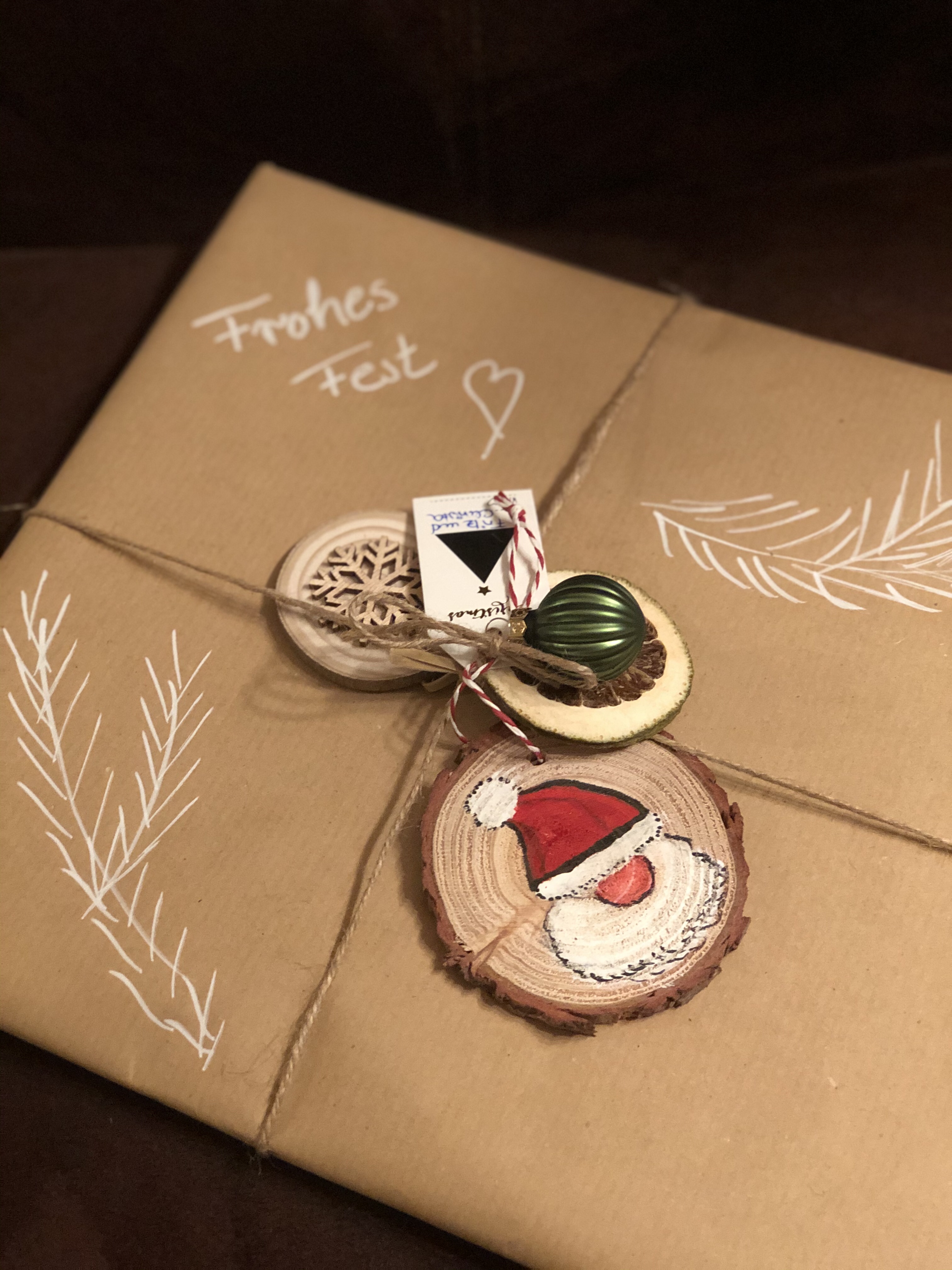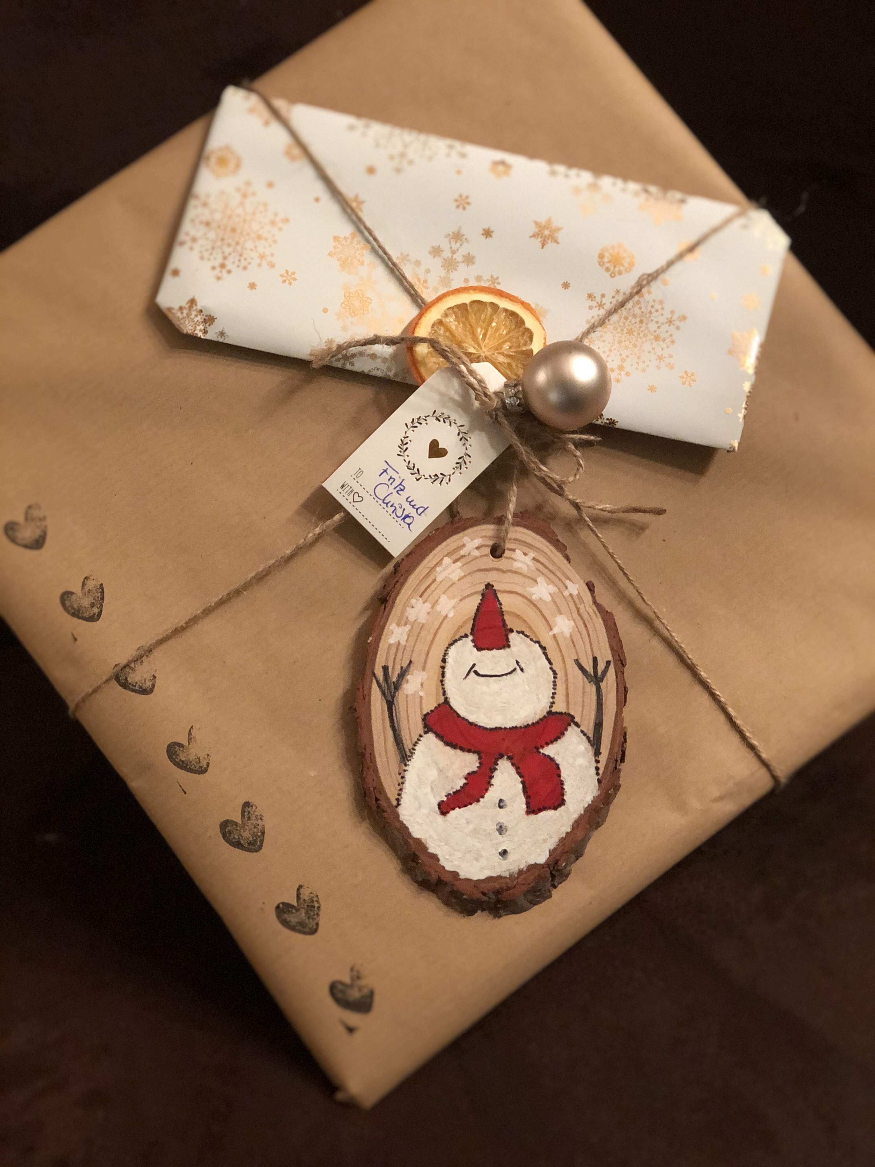 Nach dem wir das Herz festgeklebt haben, haben wir Wünsche und das Geld an Juteschnur gebunden und diese an die unteren Holzscheiben geklebt.