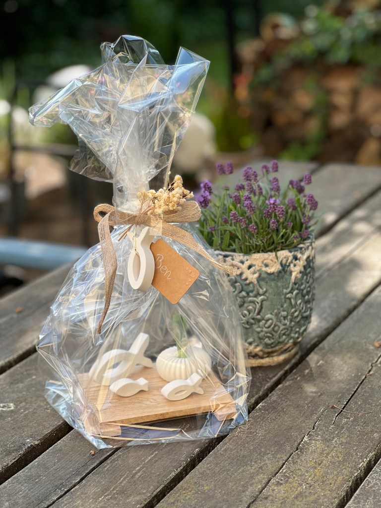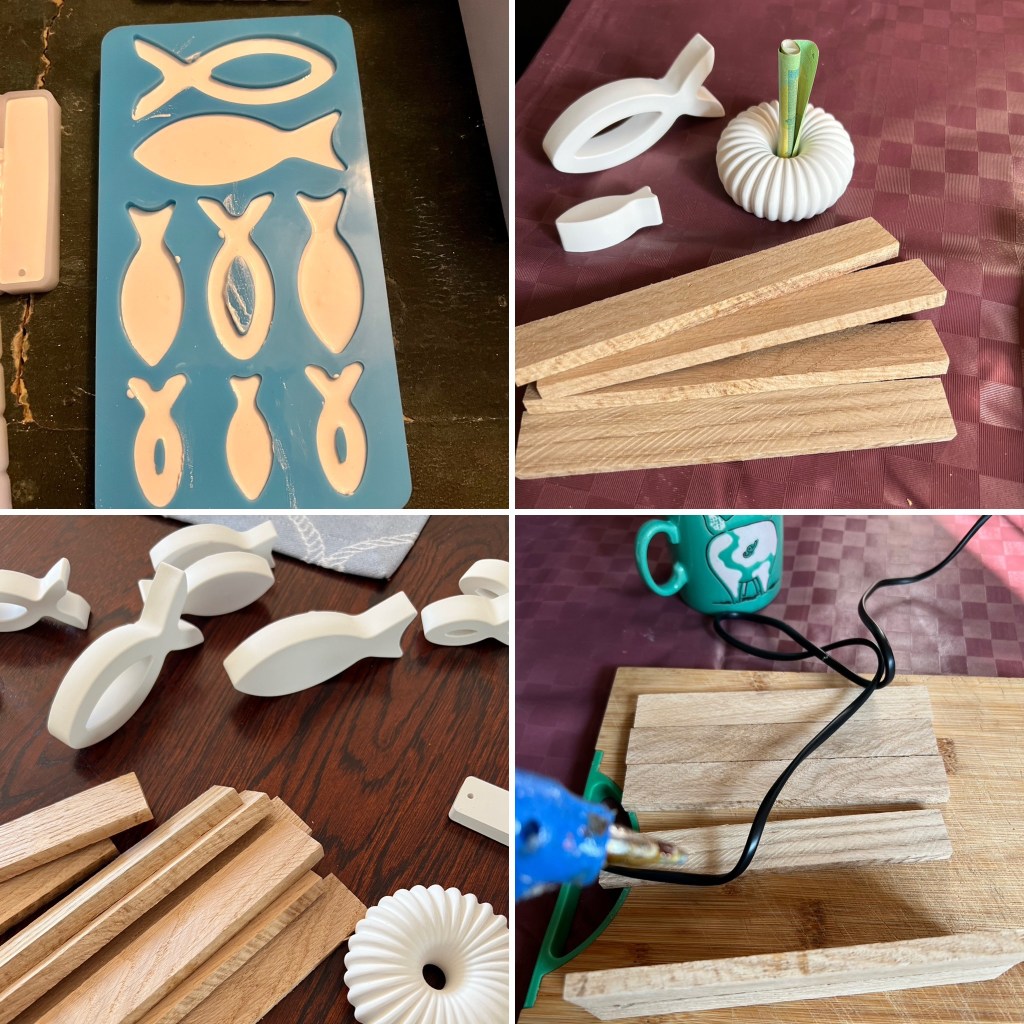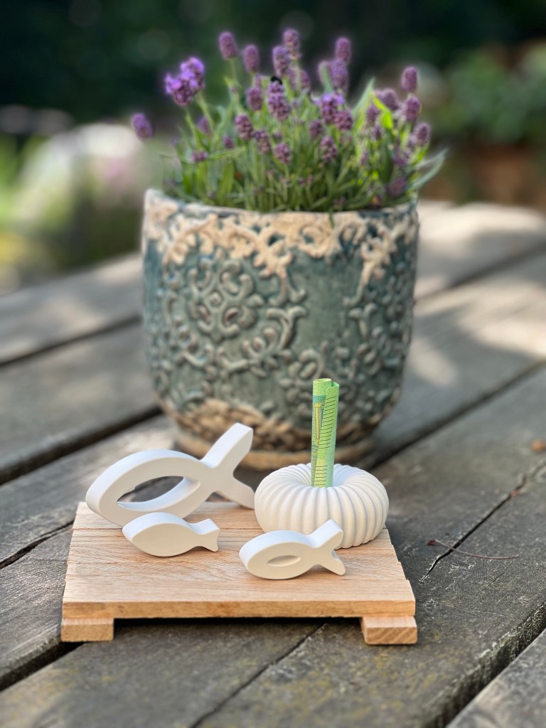 Mein lieber Schwiegervater hat für mich ein paar Holzscheiben gesägt. Ich habe eine kleine Holztischplatte bei Amazon bestellt.
