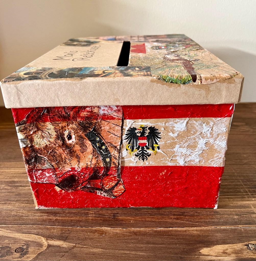 Nach dem wir das Herz festgeklebt haben, haben wir Wünsche und das Geld an Juteschnur gebunden und diese an die unteren Holzscheiben geklebt.