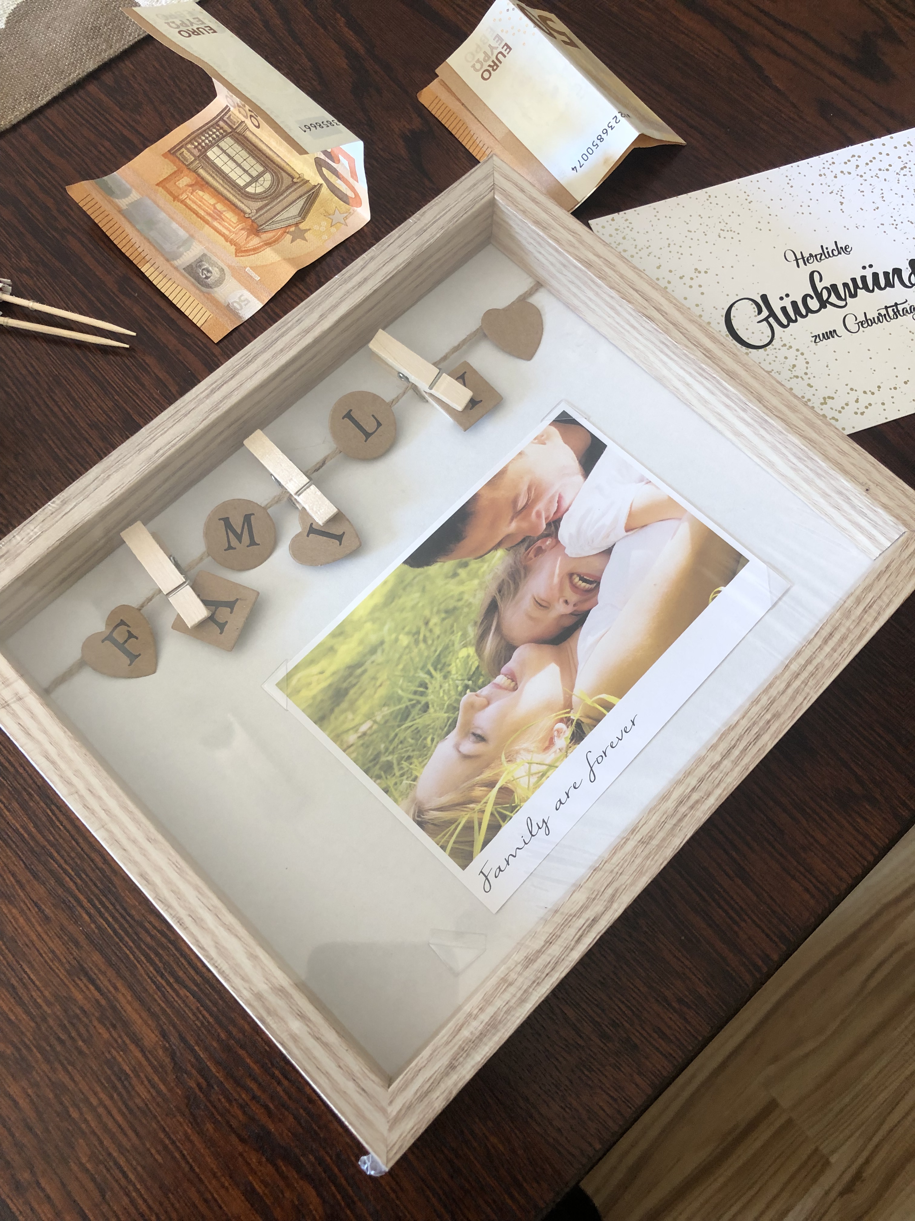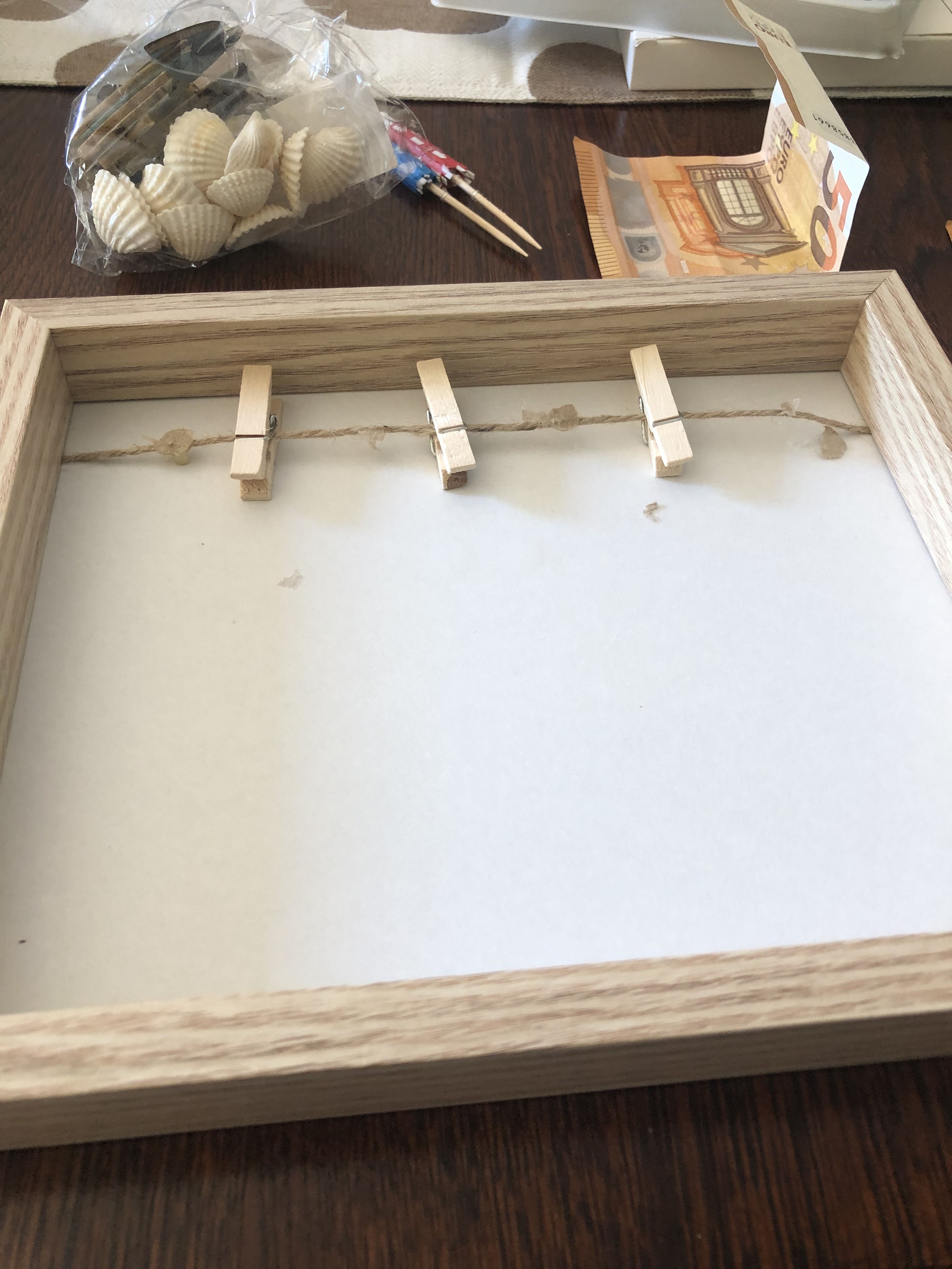 Als erstes habe ich den Bilderrahmen auseinander genommen und die Scheibe entfernt. Als Hintergrund habe ich das weiße Papier aus dem Bilderrahmen genommen und den Rahmen wieder zusammengesetzt. Dann habe ich die drei Scheine als Blütenblätter gefaltet. Als Anleitung habe ich für Euch eine Fotocollage erstellt.