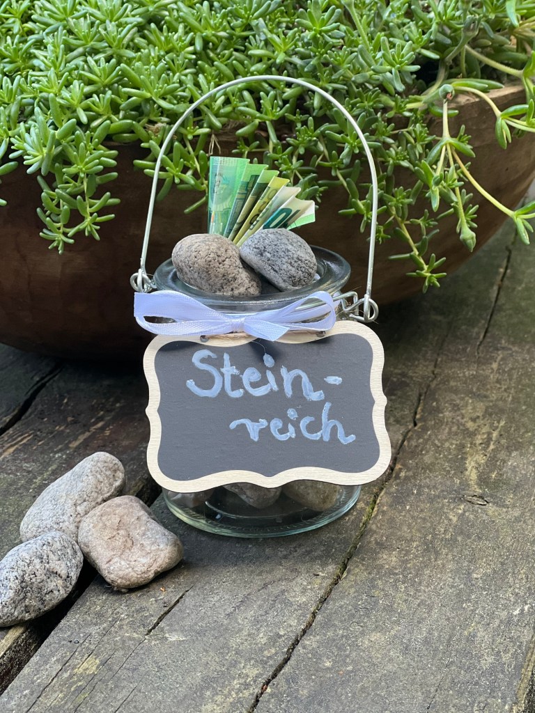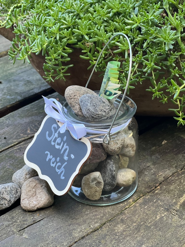 Ich habe das Windlicht mit den Steinen befüllt und den Geldschein hineingesteckt. Dann habe ich die kleine Tafel mit dem weißen Acrylstift mit dem Wort „Steinreich“ beschriftet und an das Windlicht gebunden. Und schon ist das Geldgeschenk fertig.