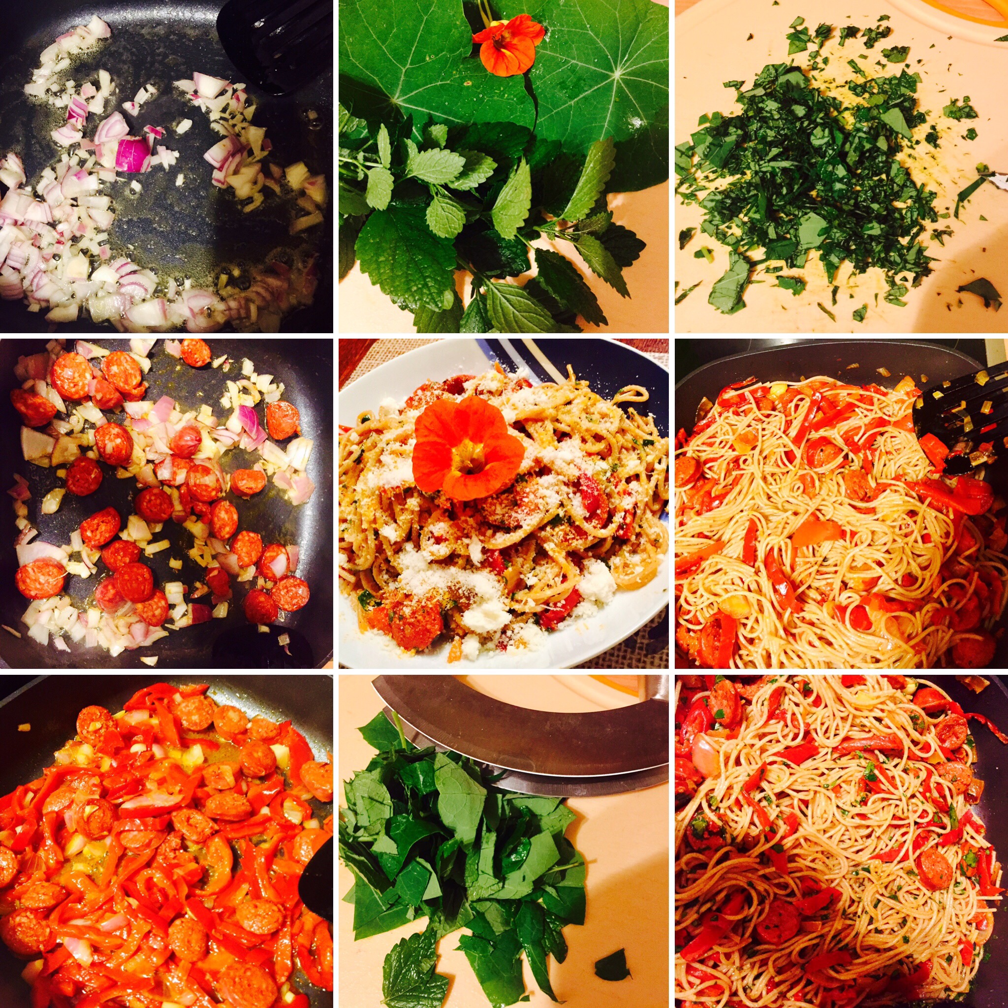 Zuerst habe ich das Nudelwasser aufgesetzt und zum Kochen gebracht. Dann kamen die Nudeln und eine Priese Salz dazu. Das ganze habe ich 10 Minuten kochen lassen. In der Zwischenzeit habe ich die Zwiebel geschält, gewürfelt und in einer Pfanne angebraten. Außerdem habe ich die Chorizo in Scheiben geschnitten und ebenfalls mit der Zwiebel angebraten. Nach ca. 5 Minuten habe ich die abgetropfte Tomatenpaprika in Streifen aus dem Glas dazugegeben und weitere 5 Minuten mit angebraten. Nun alles mit Pfeffer und Salz nach Geschmack würzen. Danach habe ich die fertigen Nudeln unter das Gemüse und die Chorizo gehoben. Vor dem Kochen habe ich meine Kräuterspirale geplündert und mich für eine Handvoll Kapuzinerkresse und Zitronenmelisse entschieden. Diese habe ich gewaschen und mit dem Wiegemesser gehackt. Nach dem ich die Pfanne vom Herd genommen habe, habe ich die Kräuter unter die Nudeln gemischt. Nach dem Anrichten auf dem Teller noch frischen Parmesan streuen und fertig ist das Essen.