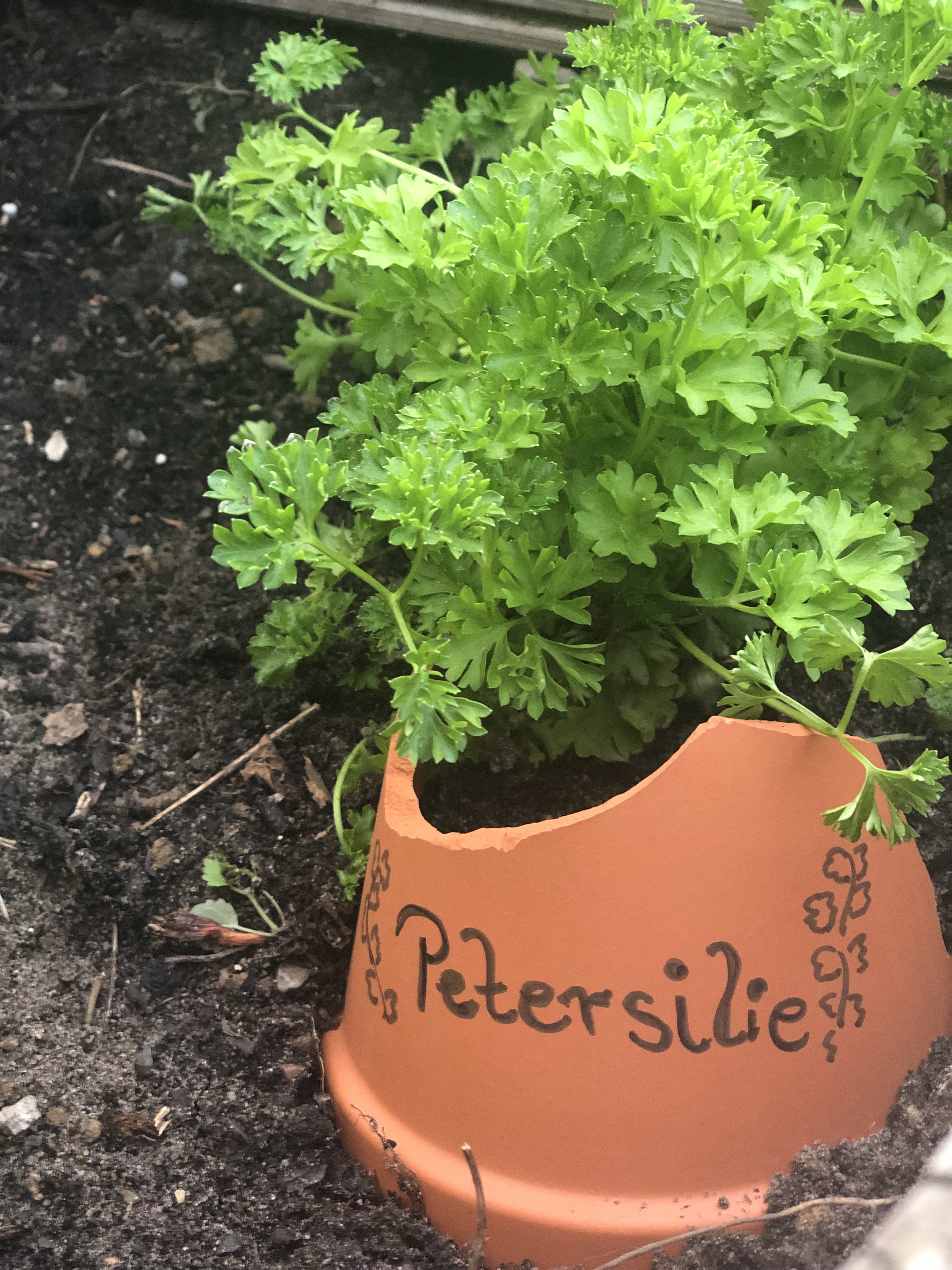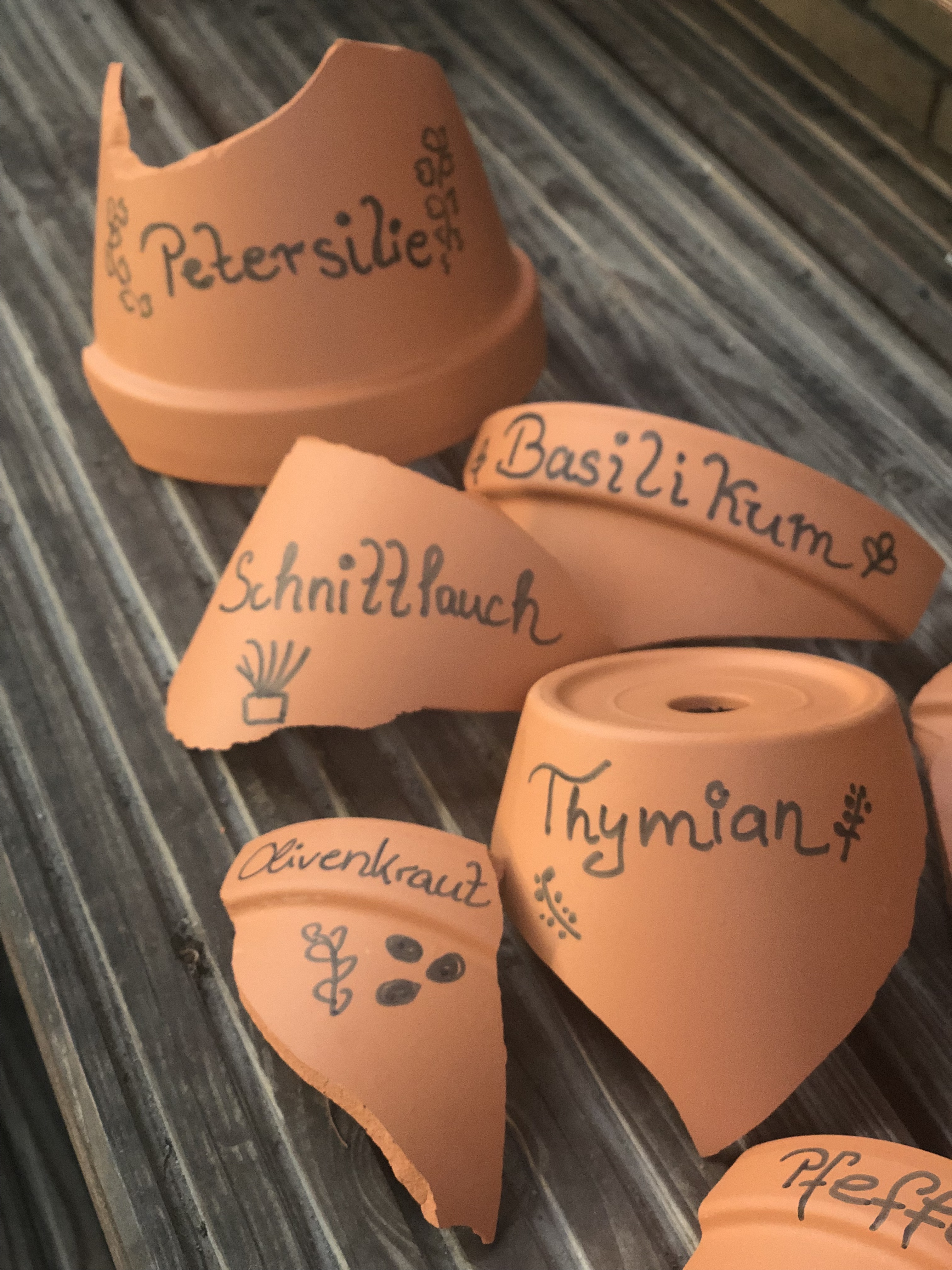 Ich habe mein Tontöpfe in einen Beutel gepackt und diesen dann auf meinen Gehweg fallen lassen und so schnell hatte ich schöne Tonscherben für meine Schilder. Nun habe ich mit einen Permanent Marker die Scherben mit den Kräuternamen beschriftet.