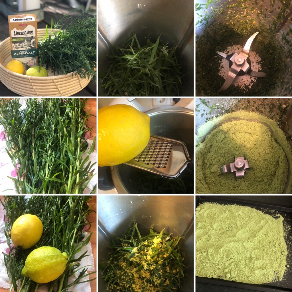 Zuerst habe ich den Estragon von meiner Kräuterspirale geerntet und diesen ordentlich gewaschen und die Blätter abgezupft. Dann habe ich die Zitronen gewaschen und die Schale abgerieben. Nun habe ich den Estragon und die Zitronenschale in den Thermomix gegeben und auf höchster Stufe zerkleinert. Jetzt habe ich das grobe Bergsalz aus den Alpen mit in den Thermomix gegeben. Ich habe mich diesmal absichtlich für Bergsalz entschieden, weil ich mir bei Meersalz nicht so sicher bin, ob da nicht vielleicht ein bisschen Microplastik dabei ist. Man hört momentan soviel davon. Dann habe ich wieder alles auf höchster Stufe klein gehäckselt. Und schon ist das Salz so gut wie fertig. Ich habe es noch 1 Tag auf einen Backblech trocknen lassen.