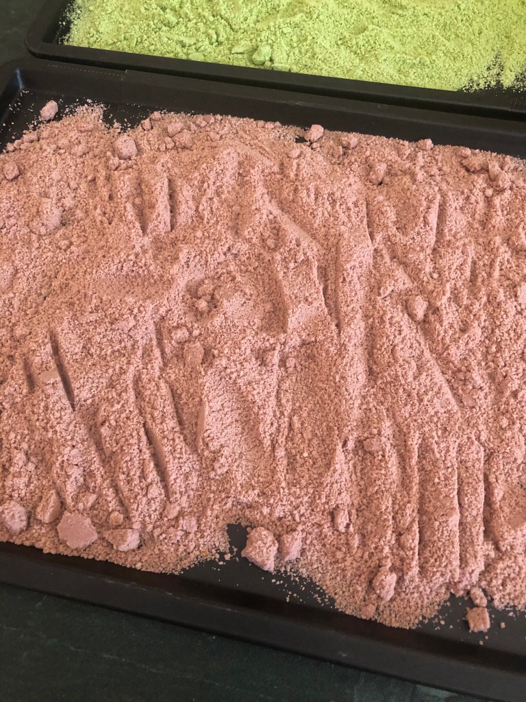 Zuerst habe die Blüten geerntet, gezupft und gewaschen. Ein kleiner Tipp hierzu, wenn Ihr die Möglichkeit habt, dass draußen zu machen, dann macht das. Ansonsten habt Ihr die ganze Küche voller Krabbeltiere. Die Blüten habe ich auch in den Thermomix gegeben und auf höchster Stufe zerkleinert. Dann habe ich das Salz mit dazugegeben und ebenfalls alles zusammen auf der höchsten Stufe gehäckselt. Auch das Salz habe ich einen Tag auf einen Backblech getrocknet.