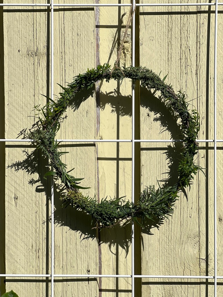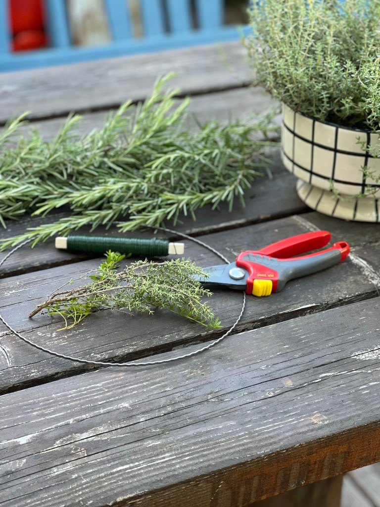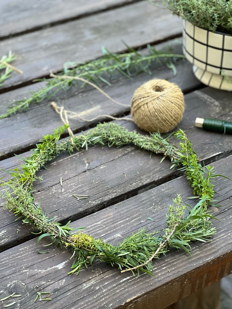 Als erstes habe ich den Kranz mit den Rosmarinzweigen und Draht umbunden. Dann habe ich den Kranz mit Estragonzweigen aufgefüllt und zu guter letzt mit Thymian aufgehübscht.