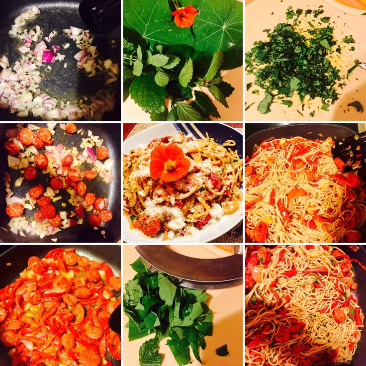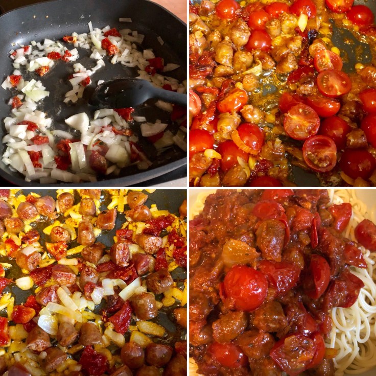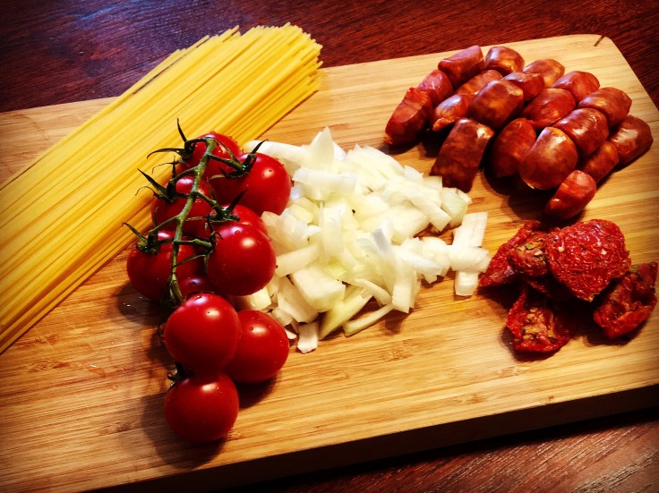 Zuerst müssen die Spaghetti nach Packungsbeilage zubereitet werden. Dann habe ich die Zwiebel, getrocknete Tomaten und die Chorizo klein geschnitten. Diese drei Zutaten müssen bei mittlerer Hitze in einer Pfanne angebraten werden. Währenddessen habe ich die Tomaten gewaschen und halbiert. Nun habe ich diese auch mit angedünstet. Danach habe ich das Pesto mit in die Pfanne gegeben und mit angebraten. Fertig ist die Soße. Man kann diese gerne noch mit Pfeffer und Salz je nach Geschmack würzen. Ich finde allerdings, dass durch die Chorizo und die getrockneten Tomaten schon eine gute Grundwürze vorhanden ist.
