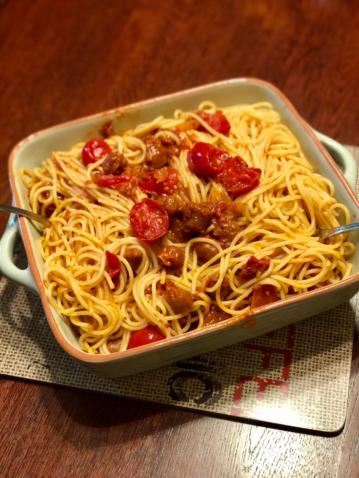 Obwohl ich eine leidenschaftliche Köchin bin, möchte ich an einen „freien“ Sonntag auch nicht Stunden lang in der Küche stehen. Deshalb gab es bei uns heute anstatt eines Sonntagsbraten Spaghetti. Und Pasta geht doch immer … und da meine Variante heute sehr schnell zu kochen ist und auch sehr lecker ist, möchte ich Euch vielleicht für den nächsten „freien“ Sonntag mein Rezept verraten.