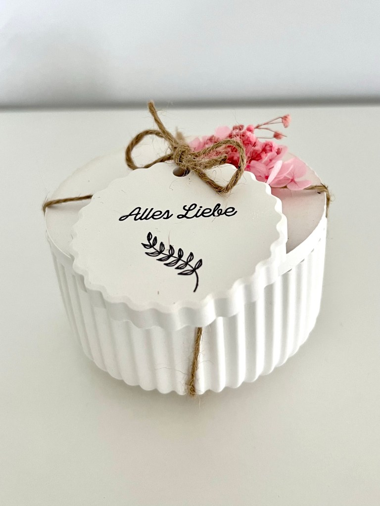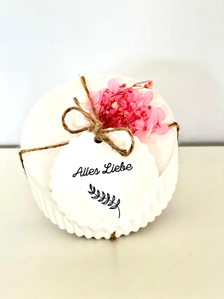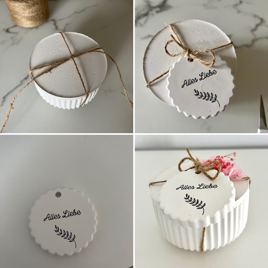 Dann habe ich etwas Juteschnur um die Schale gebunden und noch einen selbst bestempelten und gegossenen Anhänger aus Raysin ran gebunden und ein paar Trockenblumen dazu gesteckt und fertig ist die Geschenkverpackung.