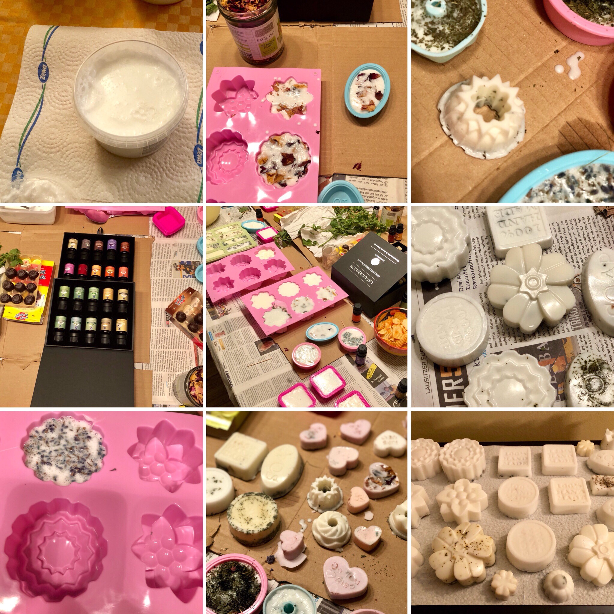 Nun habe ich die Rohseife einfach im Wasserbad verflüssigt und ein paar Tropfen von dem Duftöl dazu gegeben (Orange und Zitrone). Dann habe ich die flüssige Seife in die Silikonform gegossen und fest werden lassen. Das ging relativ schnell.