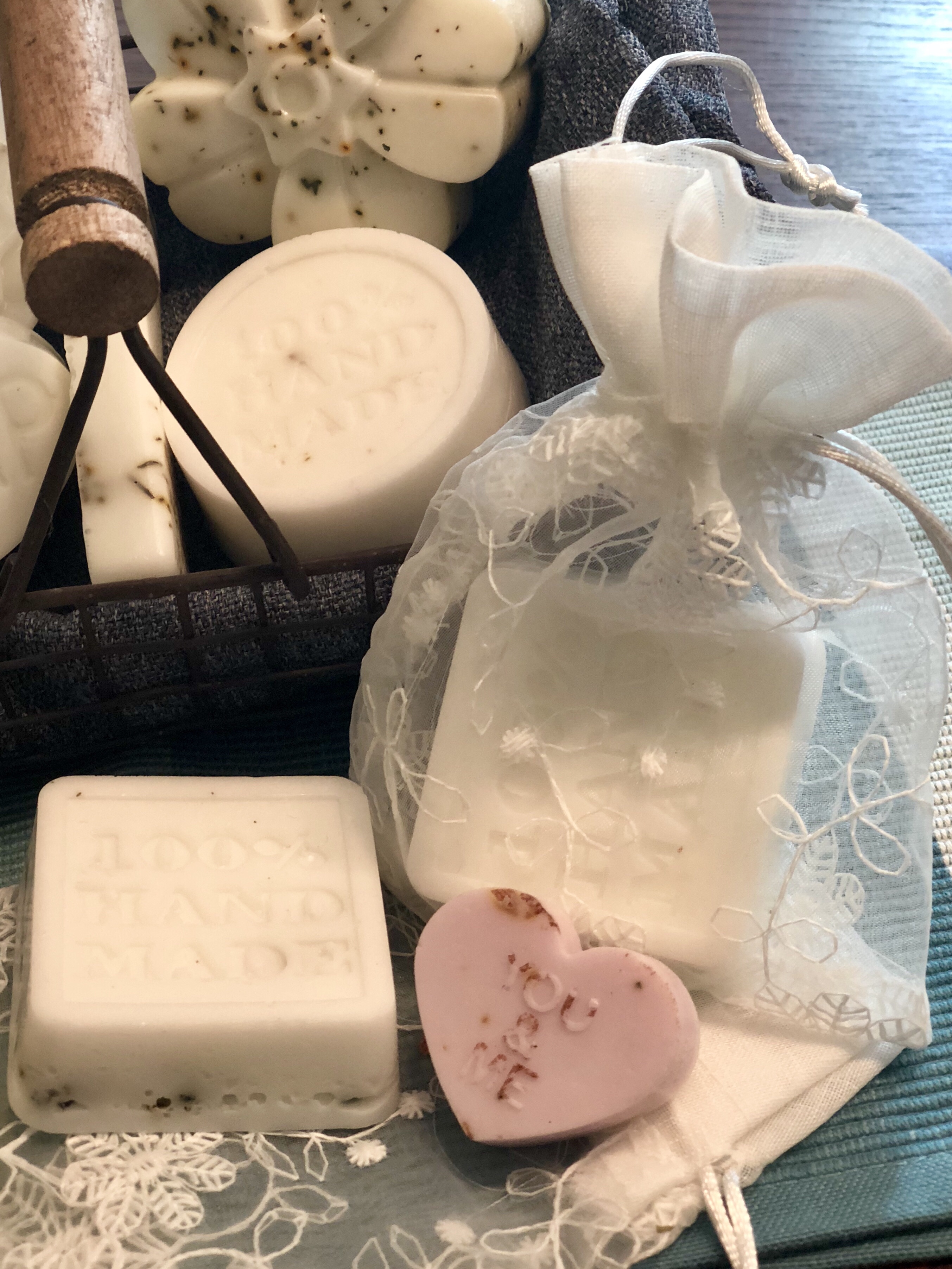 Aber die Seifen müssen natürlich auch noch verpackt werden. Ich habe sie einmal in kleine Folienbeutel (eigentlich für Pralinen) gesteckt und oben zu getackert.