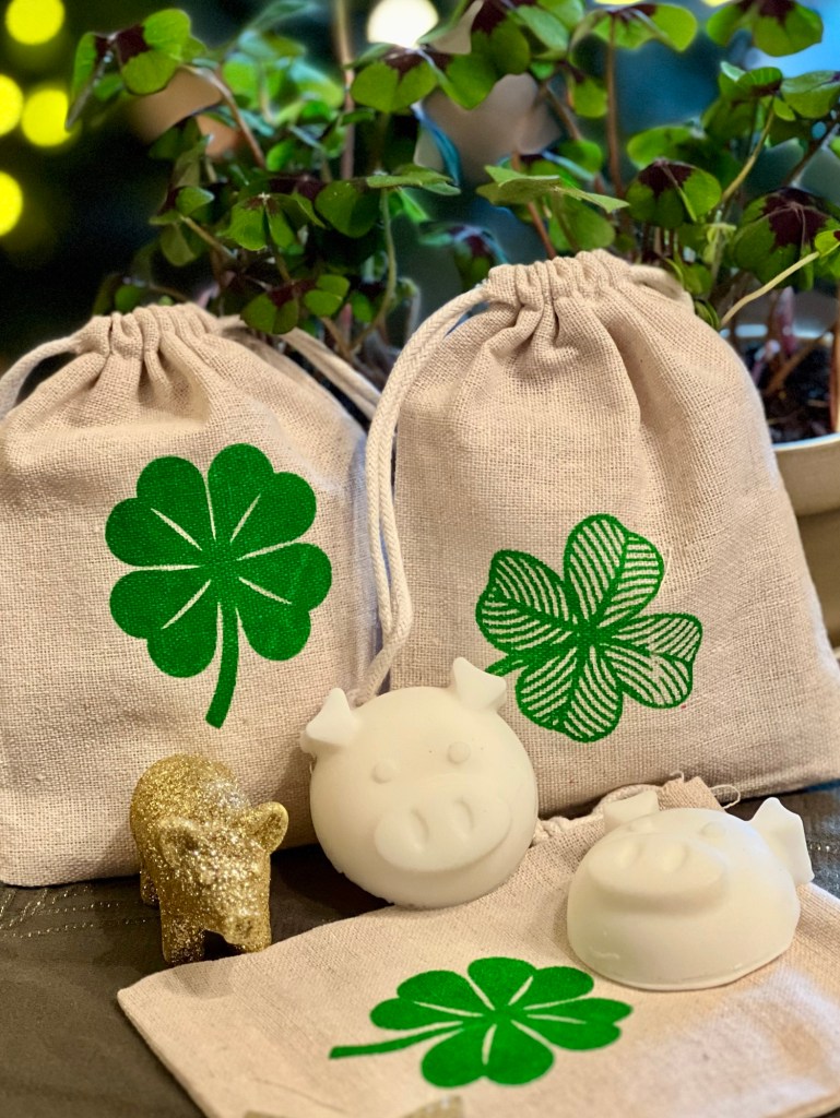 Damit die Säckchen optisch noch besser zum Thema Glücksbringer passen, habe ich mir auch über Amazon eine Siebdruckschablone von Kleeblättern und grüne Textilsiebdruckfarbe besorgt. Kaum waren die Sachen da, habe ich mit dem Druck begonnen.
