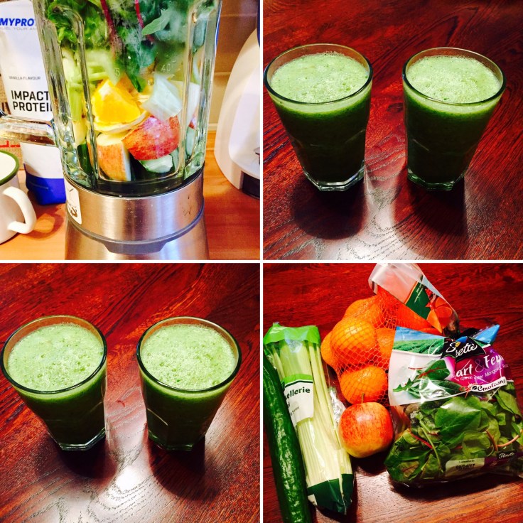 Alles zusammen in den Mixer geben, etwas Wasser dazu und auf die Smoothie – Taste drücken. Fertig! Und nun genießen…. einfach lecker. Probiert es doch mal aus. Vielleicht noch ein kleiner Tipp: Die Oma von meinem Mann hat morgen Geburtstag und wird 94 Jahre alt. Sie hat uns letztens erst erzählt, dass sie immer viel Gemüse und Obst gegessen hat. Und ich kann nur sagen für Ihre 94 Jahre ist sie sehr fit. Also ran an den Mixer! Trinkt Smoothies, dann müsst Ihr beim Essen von Obst und Gemüse nicht so viel kauen und werdet vielleicht über 90 Jahre alt.