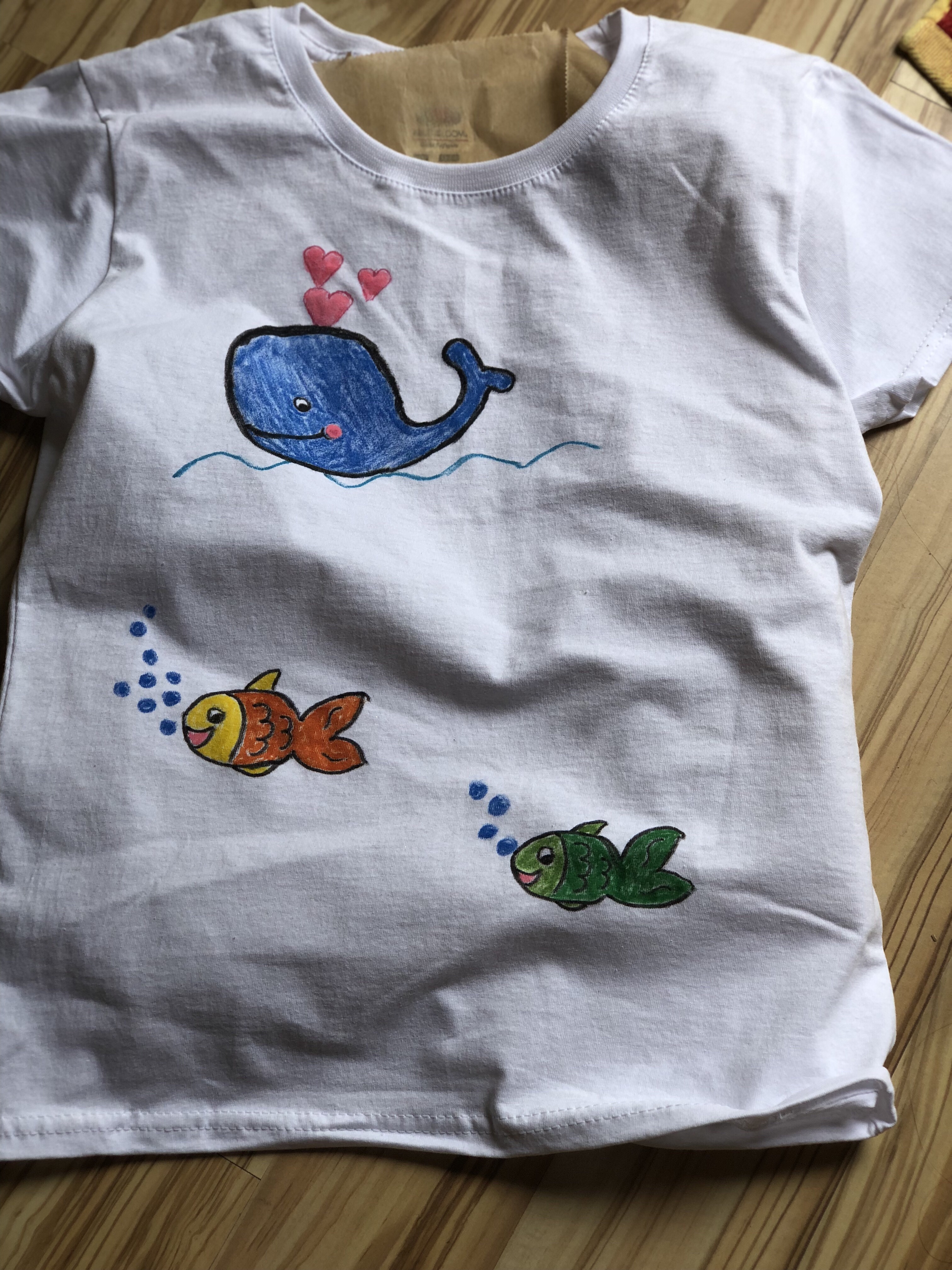 Ich habe für uns vorher bei Amazon (Werbung – unbezahlt, wegen Markennennung) Stoffbeutel, T-Shirts, diverse Textilfarbstifte und ein paar Schablonen besorgt. Und dann ging es auch los … zuerst haben wir uns über die Beutel hergemacht und dann haben sich die Kinder an die T – Shirts gewagt. Wichtig ist, dass man unter der zu bemalenden Stoffseite Backpapier legt, damit die Farbe sich nicht durch drückt. Die beiden Mädchen können auch sehr gut ohne Schablonen Motive malen. Ich war richtig baff …. Es ist dabei ein Wal, Fische, Avocado, Einhörner und noch viel mehr entstanden.