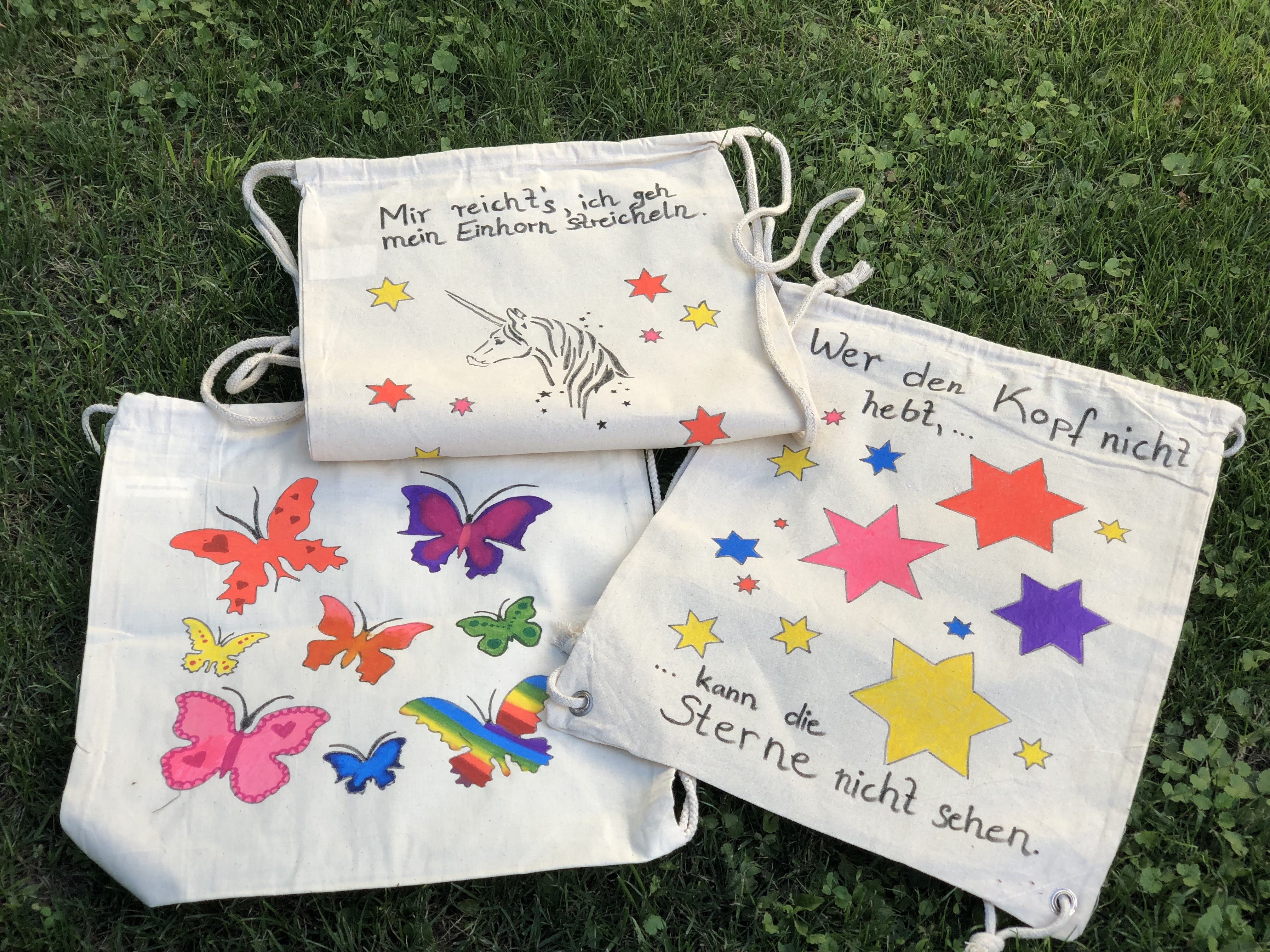 Die freihändigen Motive haben wir vorher auf Papier geübt und dann haben die Mädchen sie auf den jeweiligen Stoff übertragen. Danach muss man etwas Geduld haben, weil die Farbe erstmal trocknen muss (je nach Farbart 6 – 72 h). Dann habe ich einmal über die Motive auf niedrigster Stufe drüber gebügelt (ein Blatt Backpapier habe ich zwischen den Stoff und den Bügeleisen gelegt). Dadurch soll die Farbe fixiert werden. Nun kann man die Textilien bei 30 Grad waschen ohne dass die Farbe verschwindet.