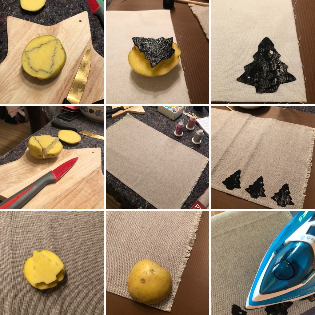 Für die genähten Servietten von meiner Freundin habe ich den Druck einfach nur mit einer kleinen halben Kartoffel durch geführt. Wir bei den Tannenbaum habe ich die Kartoffel mit der Textilfarbe mit einen Pinsel bestrichen. Vorher habe ich auf die Serviette 4 Striche mit einen Textilstift gemalt. Mit der kleinen Kartoffel habe ich dann die Blätter entlang der Striche gedruckt.