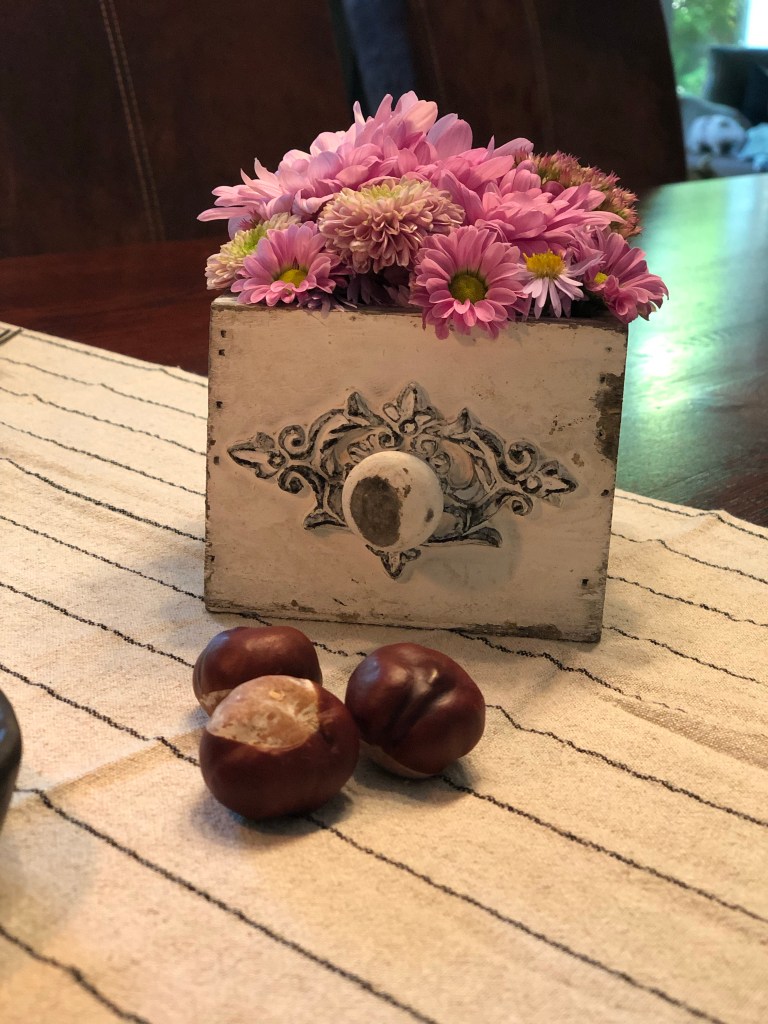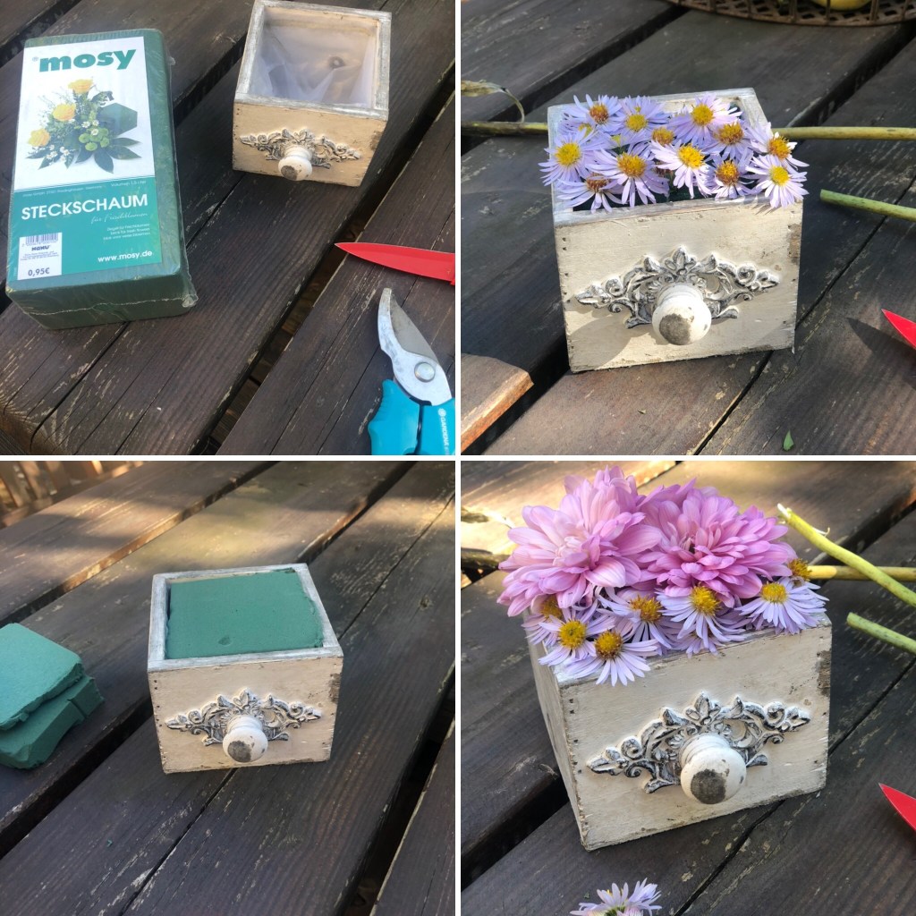 Wenn Euch meine Tischdeko gefällt, dann könnt ihr diese auch ganz schnell selbst machen. Die kleine Schublade hatte ich in einen Set über Amazon gekauft. Diese habe ich mit Steckmasse gefüllt und mich bei den Blüten in meinen Garten bedient.