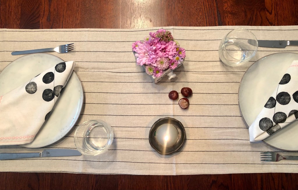 Nun habe ich den fertigen Tischläufer auf unseren Esstisch platziert. Und darauf einen wunderschönen Blumenstrauß mit passender Vase von Blume 2000 darauf gestellt.