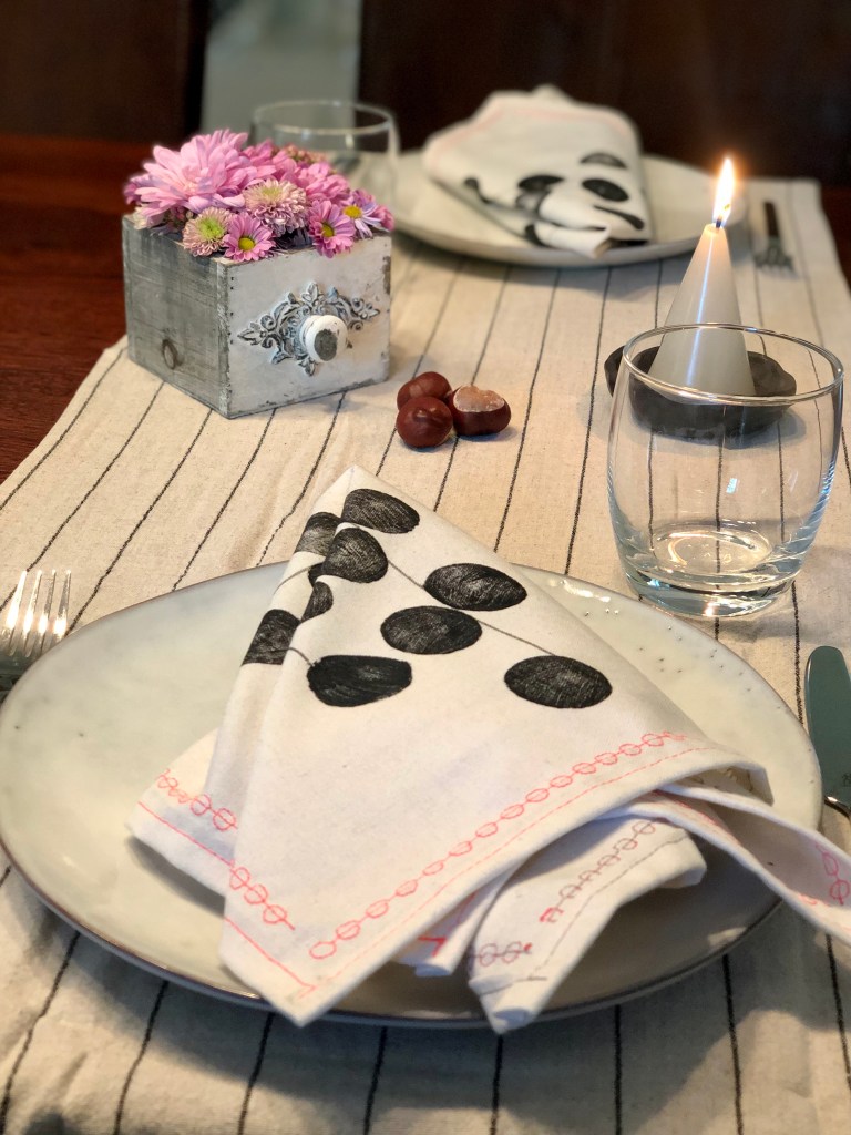 Vor längerer Zeit habe ich auch mal mit Kartoffeldruck Servietten bedruckt. Das Ergebnis findet Ihr auch hier auf dem Blog.