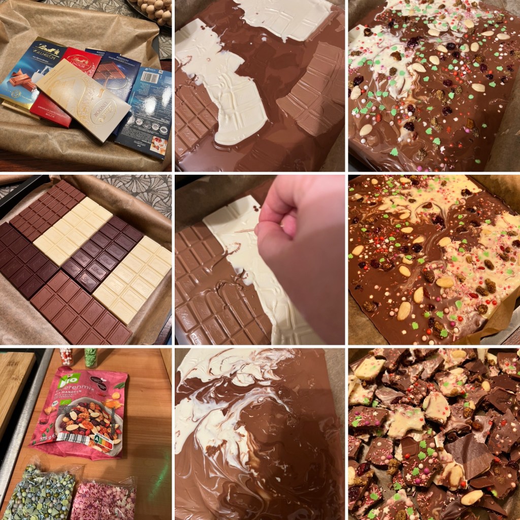 Meine zweite Last Minute Idee ist Bruchschokolade. Jeder der auf Instagram ist, kennt die Bruchschokolade bestimmt. Aber ich wollte es auch mal ausprobieren. Ihr braucht einfach unterschiedliche Sorten Schokolade (hell und dunkel). Diese legt ihr auf ein Blech mit Backpapier und stellt sie bei 150 Grad für ca. 10 Minuten in den Ofen. Dann schmilzt die Schokolade und man kann sie z.B. mit einen Zahnstocher vermischen.