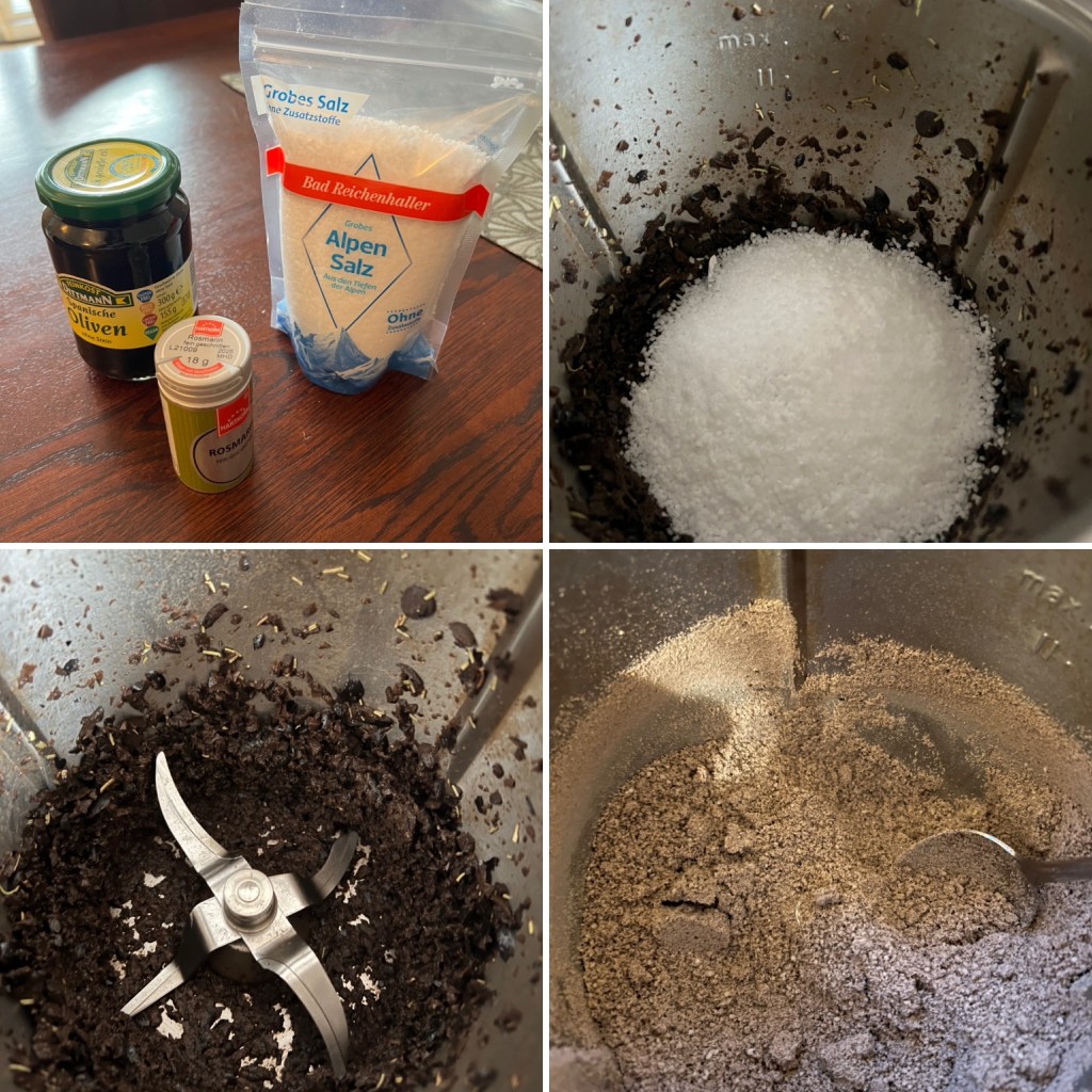 Dann habe ich mit meinen Thermomix ein Olivensalz gezaubert. Diese Idee habe ich auf Pinterest entdeckt. Ich habe auf 500 g grobes Steinsalz ein Glas schwarze Oliven und einen Teelöffel getrockneten Rosmarin und etwas Pfeffer verwendet.