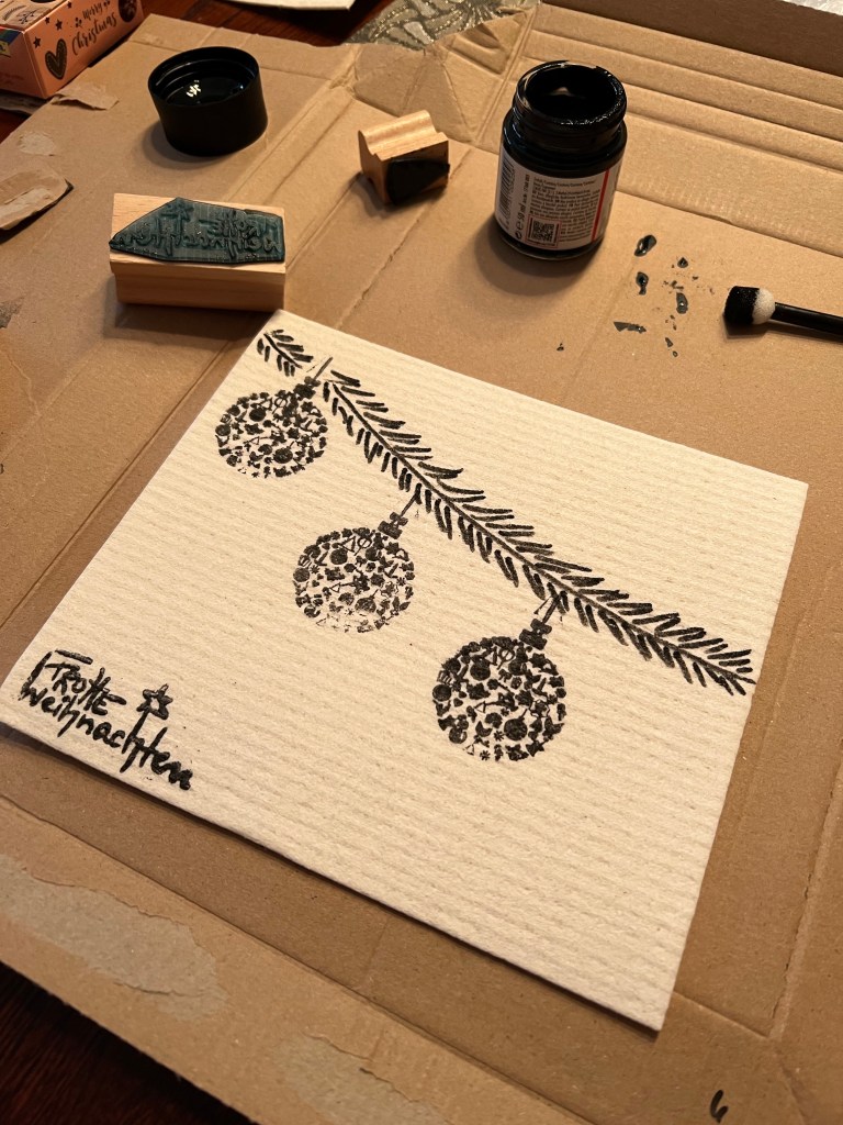 Wenn die Farbe getrocknet ist, kann man die Textilfarbe mit Bügeln fixieren. Dann müsste man ohne Probleme mit den Schwammtüchern abwaschen können und auch bis zu 40 Grad abwaschen können. Also ich hätte ewig weiter stempeln können, es hatte eine beruhigende Wirkung. Ich finde es ist eine schöne kleine Idee – ganz nach dem Motto „I Wisch 😉you a merry christmas“.