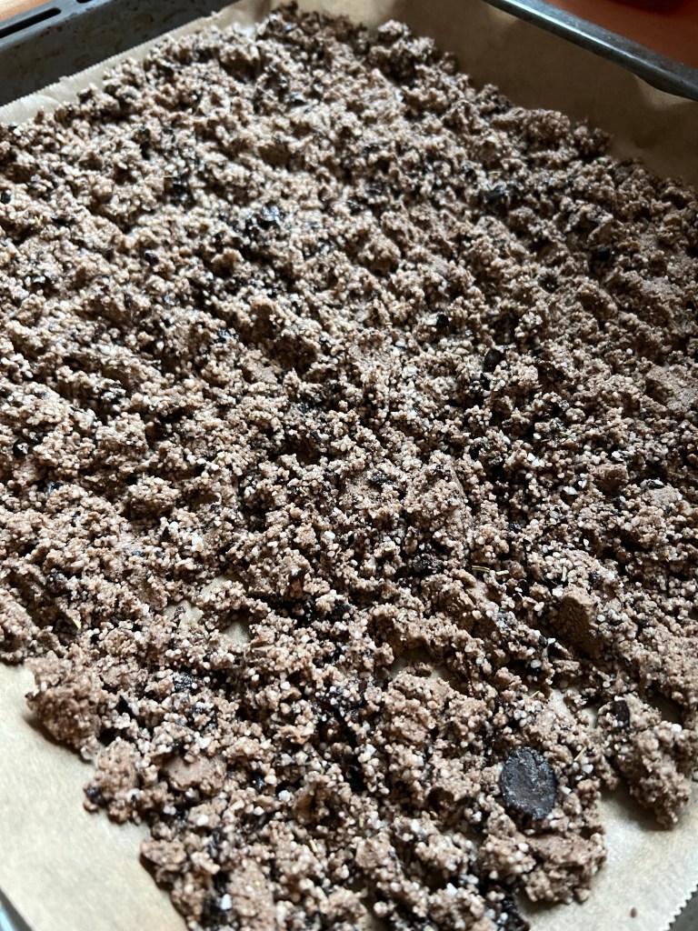 Ich habe die abgetropften Oliven zusammen mit den Rosmarin klein gehäckselt. Dann habe ich das Salz darunter gemischt und zum Teil zusammen gemahlen. Danach habe ich die Masse im Ofen bei 100 Grad für ca. eine Stunde getrocknet.