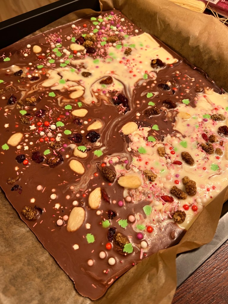 Dann „schmeißt“ ihr alles nach Euren Wünschen in die flüssige Schokolade. Ich habe mich für getrocknete Beeren, Mandeln und bunte Streuselmischungen entschieden.