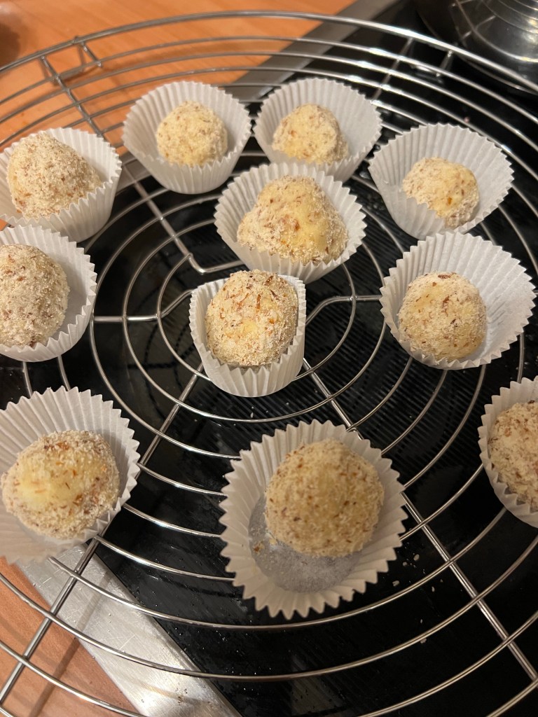 Für die Süßschnäbel habe ich noch Eierlikörpralinen mit Mandeln gezaubert. Dafür habe ich 400 g weiße Schokolade, 40 g Butter und 160 g gemahlene Mandeln, 100 g Eierlikör und dann nochmal 40 g Mandeln (gemahlen) zum Wälzen der Pralinen verwendet. Zuerst habe ich die Schokolade mit der Butter geschmolzen und dann den Eierlikör und die Mandeln darunter gemischt. Die Masse muss für 3 Stunden in den Kühlschrank. Nach der Kühlung formt man aus der Masse kleine Kugeln und wälzt diese dann in den restlichen gemahlenen Mandel. Fertig sind die Pralinen.