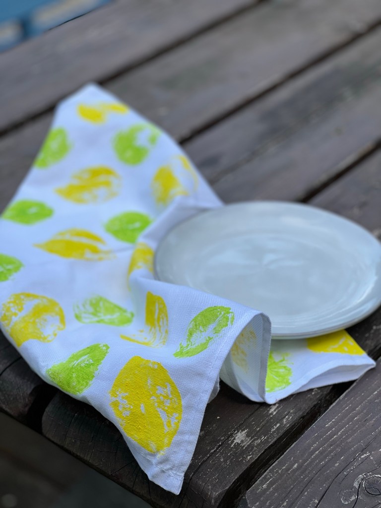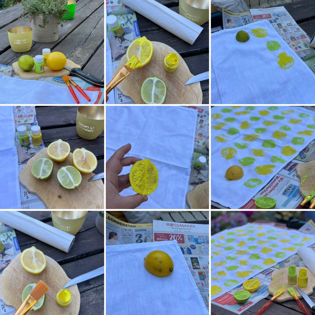 Ich liebe ja Geschirrtücher aller Art und nach dem ich auf Pinterest schöne Stempelideen mit Gemüse und Obst entdeckt habe, konnte ich es kaum erwarten es auszuprobieren. Zuerst habe ich mir weiße Geschirrtücher und Textilfarbe bei Amazon bestellt. Als die Lieferung ankam, konnte ich auch schon loslegen. Passend zum Sommer hatte ich Lust auf schöne satte Farben und was passt besser zum Sommer als Limetten und Zitronen.