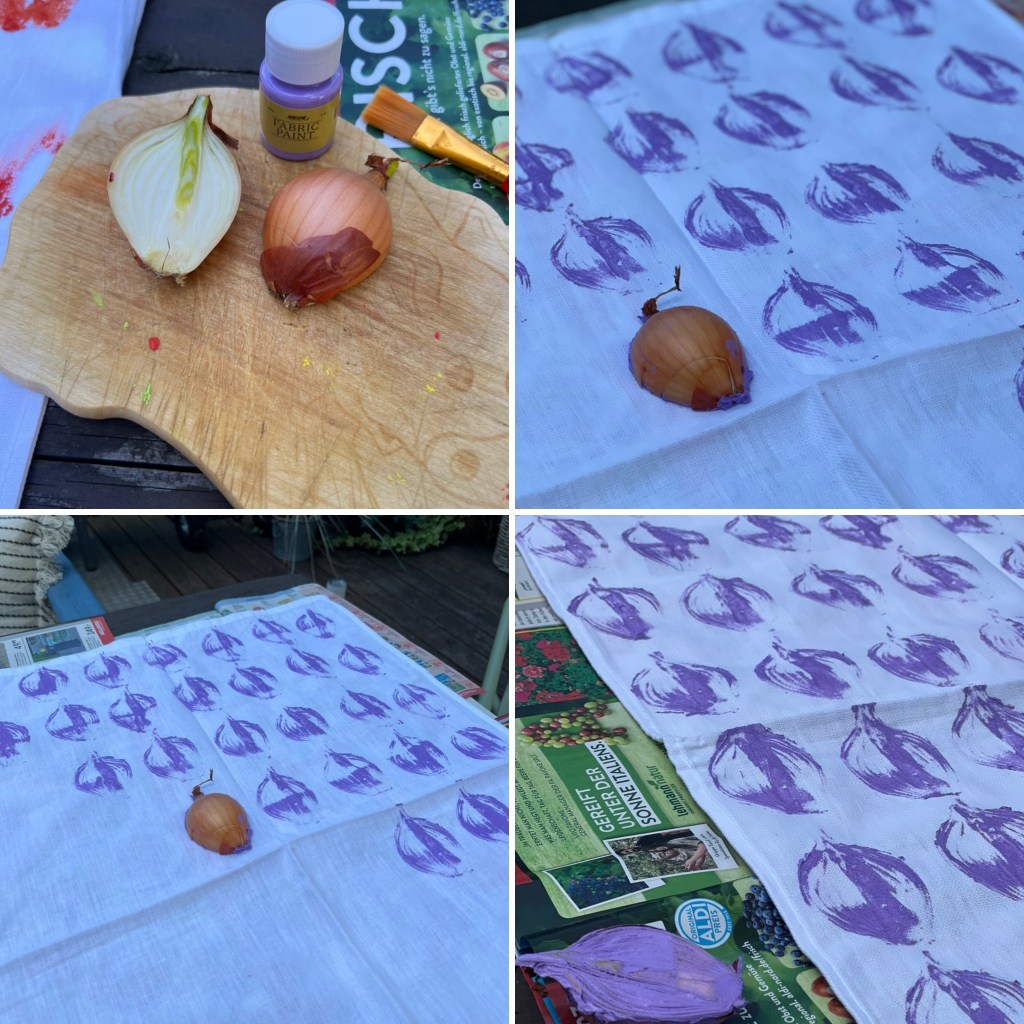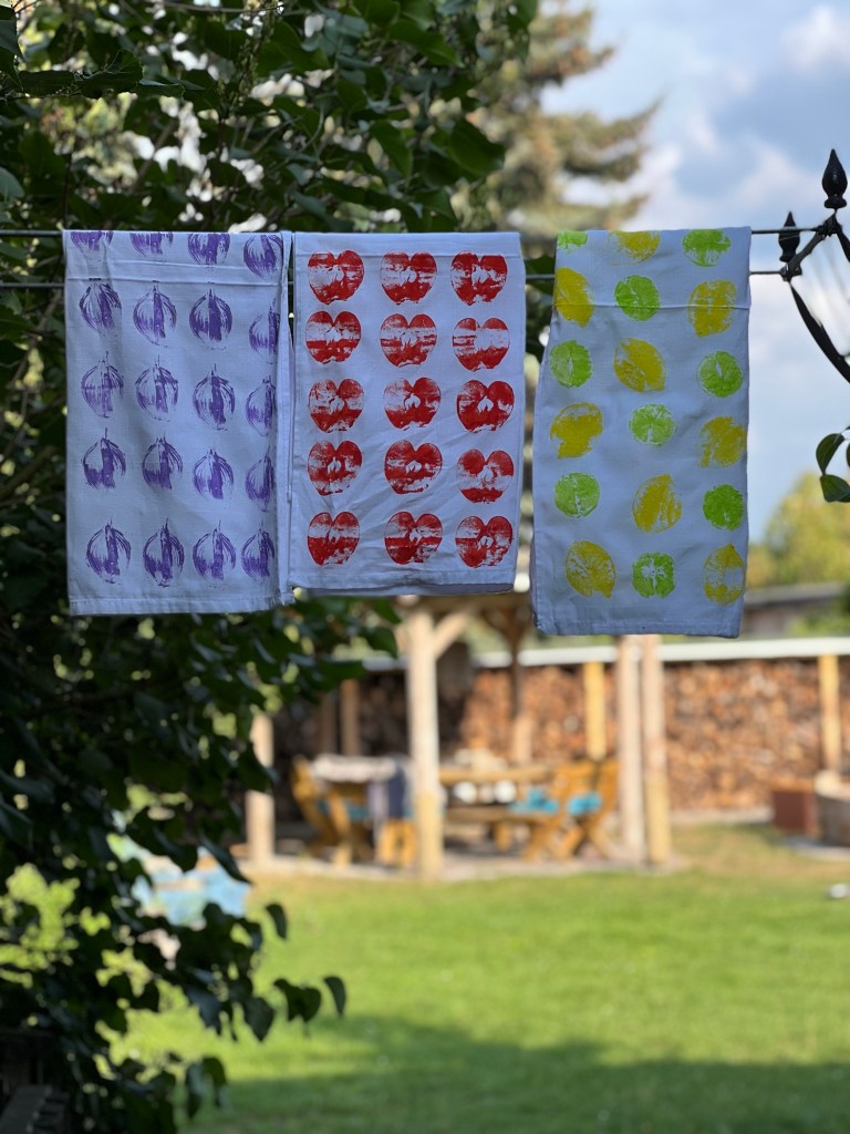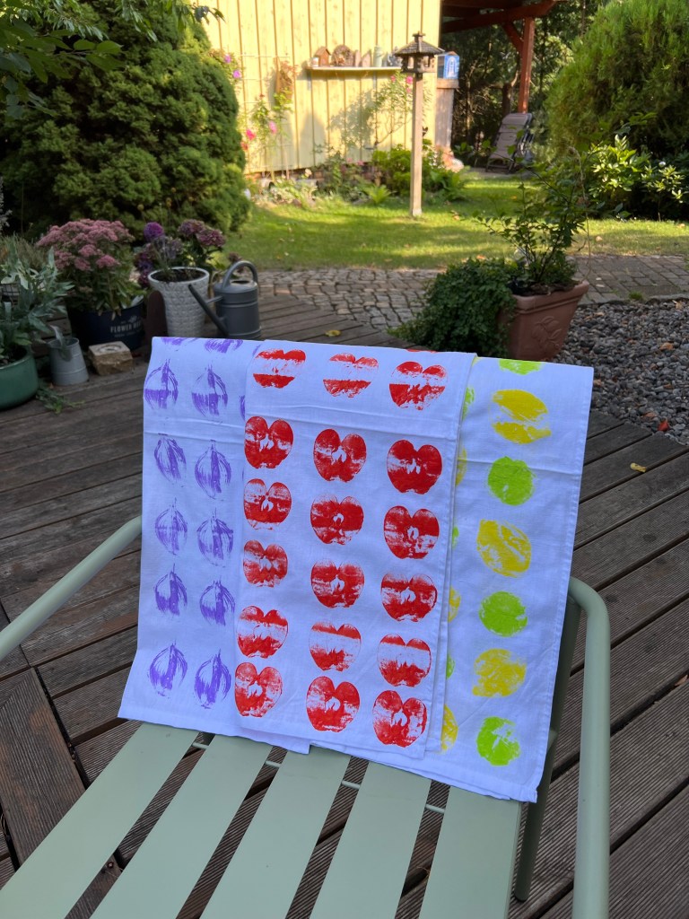 Neben Limette und Zitrone habe ich noch einen halben Apfel und eine halbe Zwiebel nach dem selben Prinzip zum Bedrucken weiterer weißer Geschirrtücher benutzt.