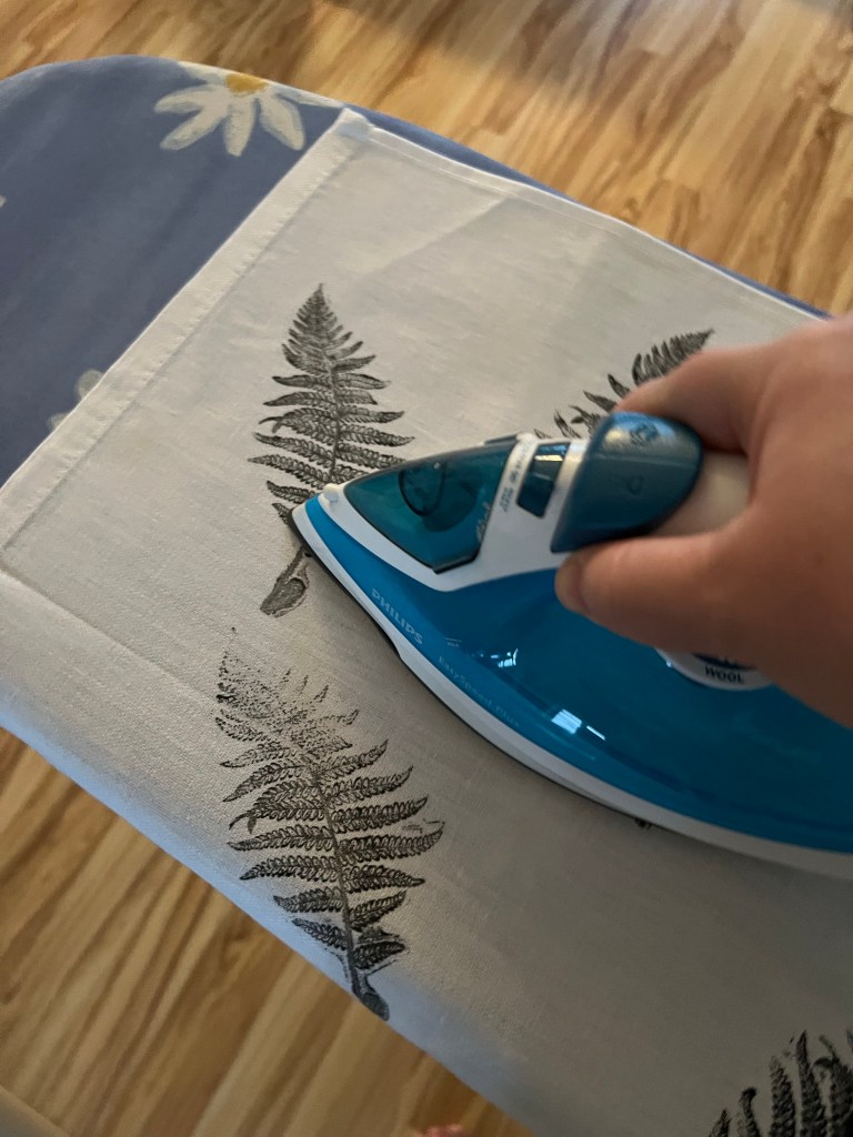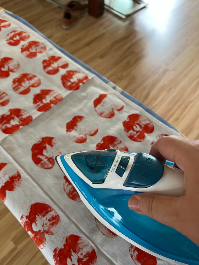 Ich habe das bedruckte Geschirrtuch über Nacht trocknen lassen und danach habe ich es zum Fixieren der Farbe gebügelt.