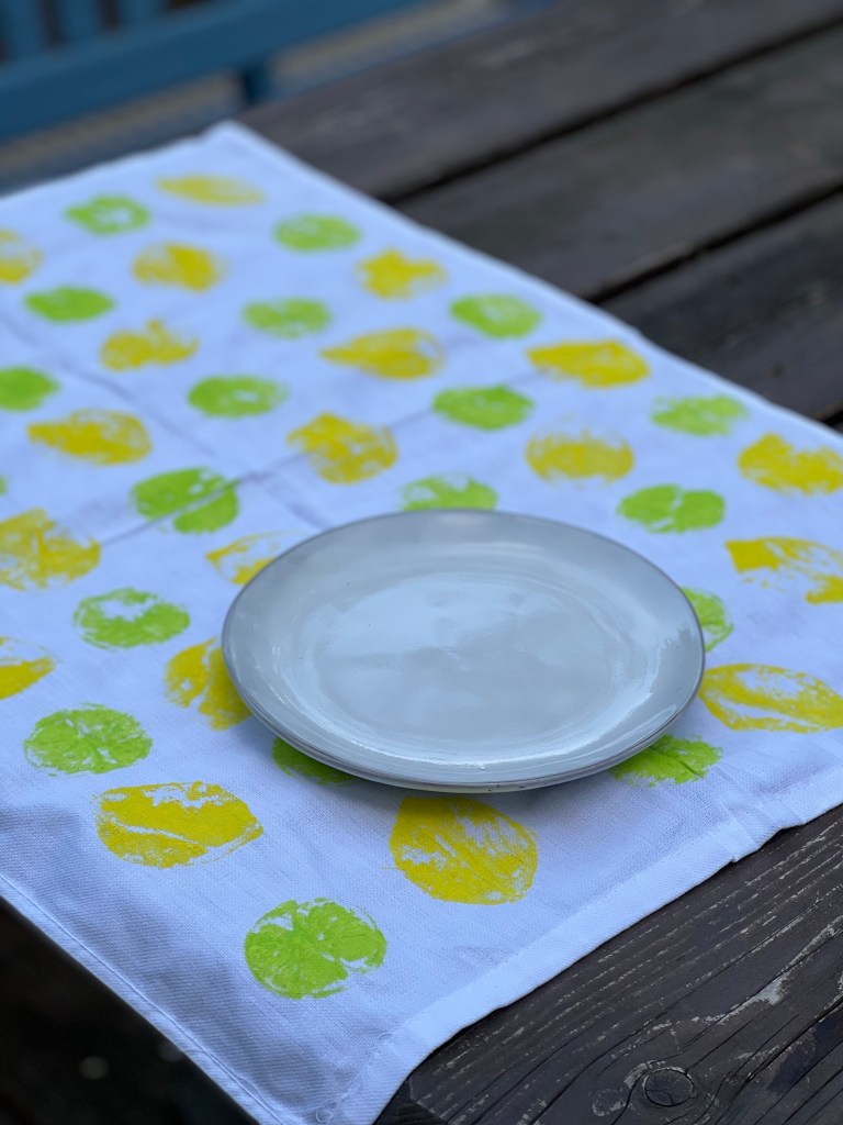 Ich habe mein weißes Geschirrtuch auf einer Unterlage ausgebreitet und die Zitrone und die Limette mit einen Messer halbiert. Die Schnittfläche sollte schön eben sein. Dann habe ich mit einen Pinsel die Farbe auf die Zitronenhälfte aufgetragen und dann los gestempelt. Für jeden Druck habe ich neue Farbe aufgetragen. Ich habe für diesen Druck abwechselnd mit Zitrone und Limette gestempelt.