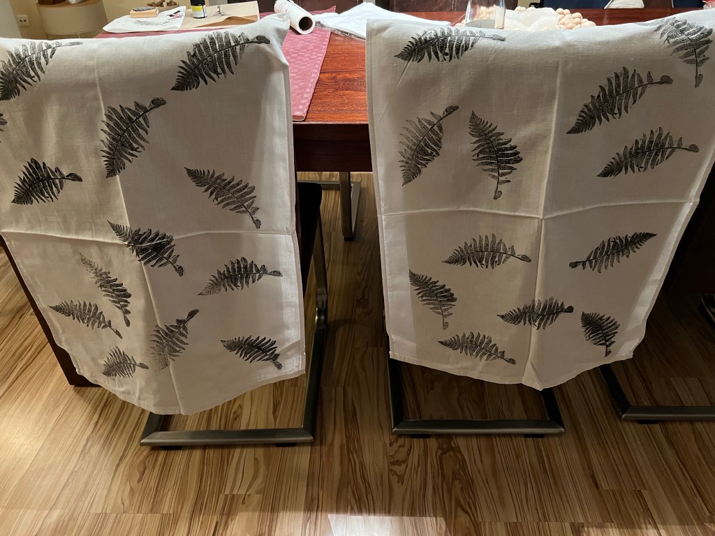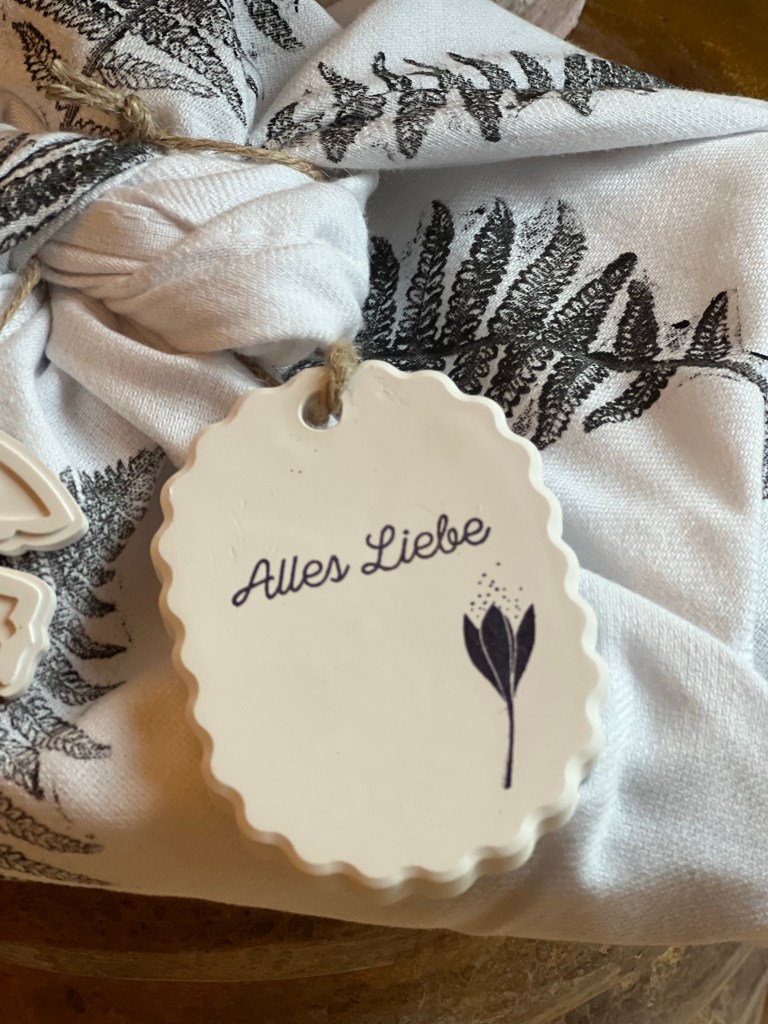 Für die Verpackung für das Geschenk habe ich wieder ein Geschirrtuch genommen. Ich habe ja momentan eine Vorliebe für Stempel. Ich hatte im Internet einen richtig schönen und großen Stempel mit dem Motiv Farne entdeckt und habe mir diesen gekauft. Mit diesen Stempel habe ich das Geschirrtuch bestempelt. Ich habe dafür den Stempel mit schwarzer Textilfarbe mit einen Pinsel bestrichen und mit den Stempeln losgelegt.