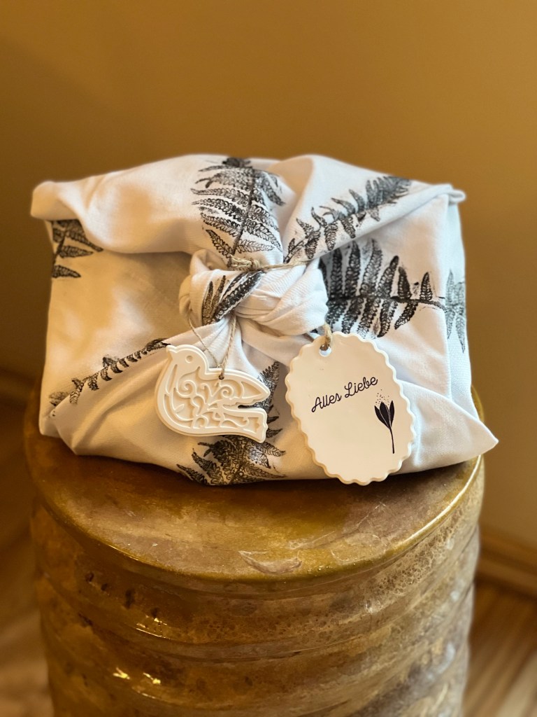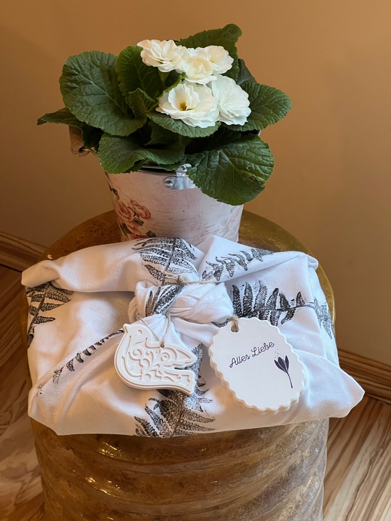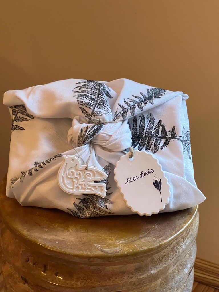 Danach habe ich mit der Verpackung angefangen. Ich habe das Geschenk diagonal auf das Geschirrtuch gelegt.