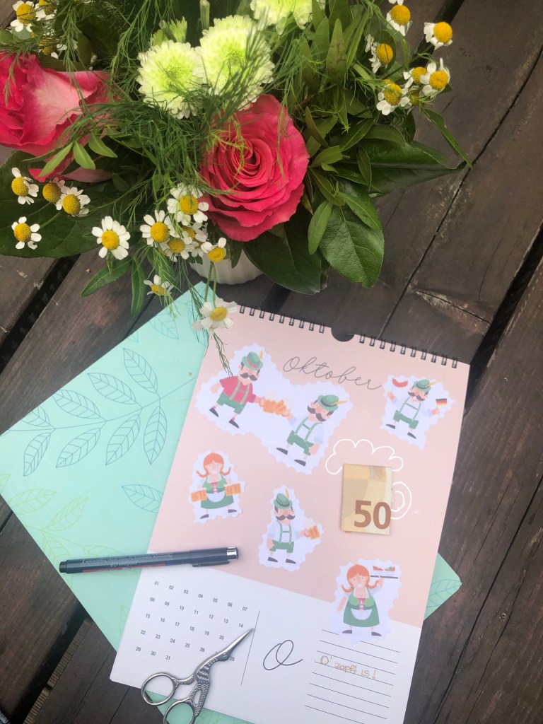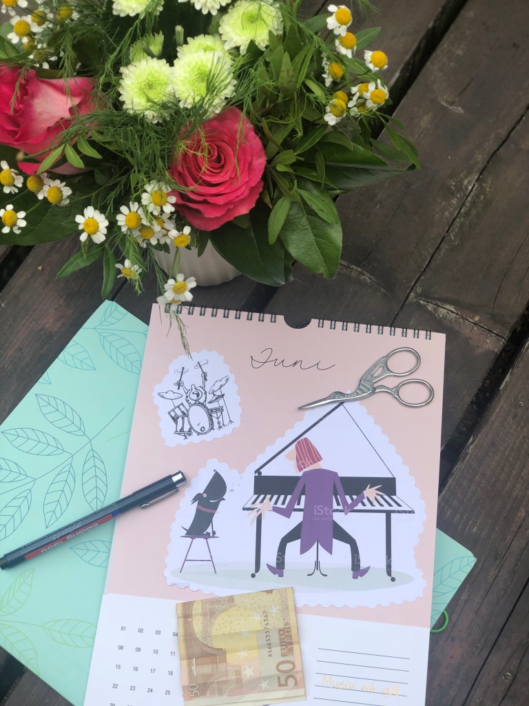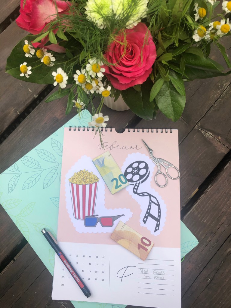 Wir haben uns zuerst eine Liste für 12 Erlebnisse gemacht und das zu verschenkende Geld in der jeweiligen Höhe zugeordnet. Danach haben wir Bilder zu den einzelnen Erlebnissen über das Internet herausgesucht und ausgedruckt und für jede Kalenderseite zurecht geschnitten.