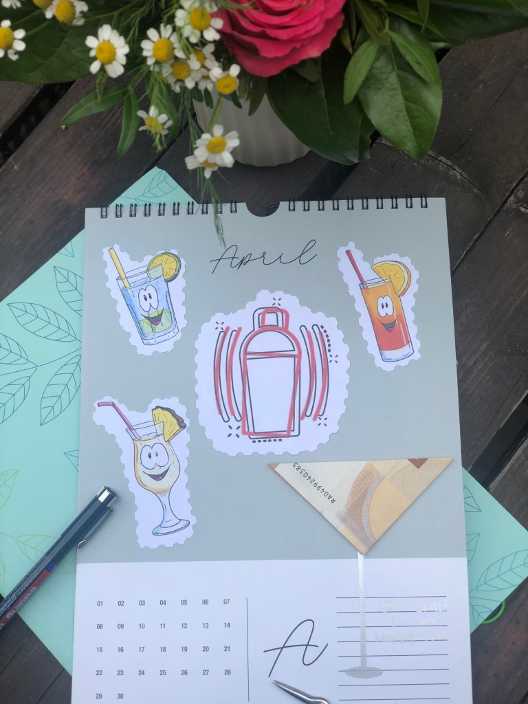 Nun haben wir die einzelnen Kalenderseiten Stück für Stück gestaltet. Die ausgeschnittenen Bilder und das Geld haben wir mit Fotoecken auf die Kalenderseiten geklebt.