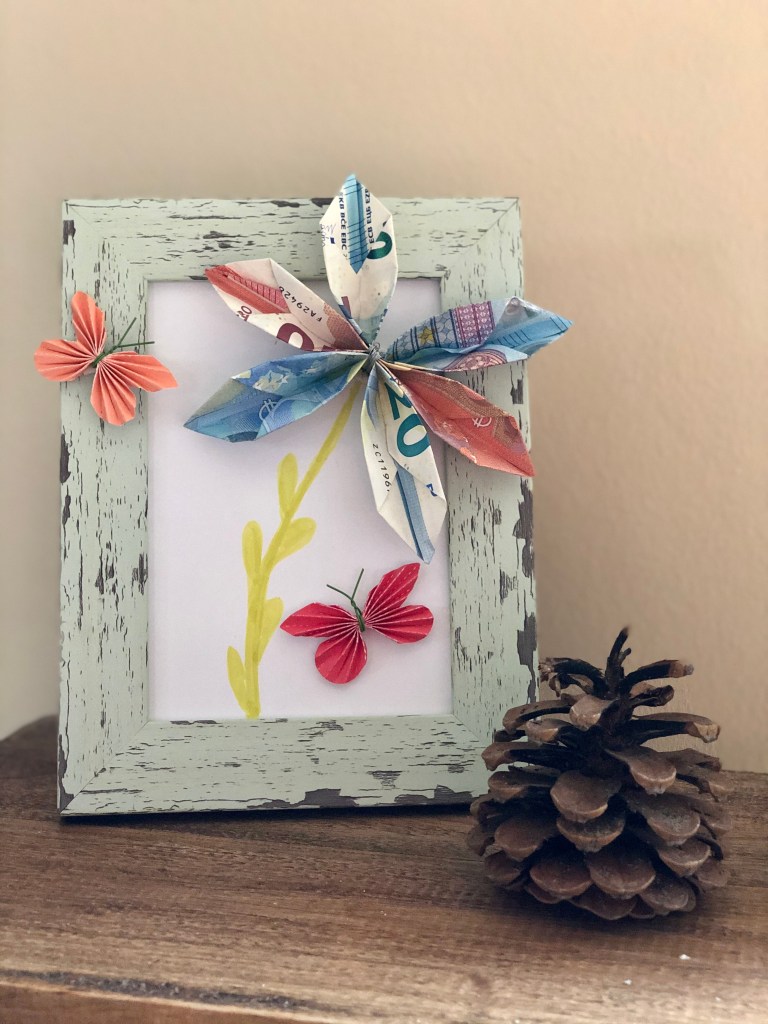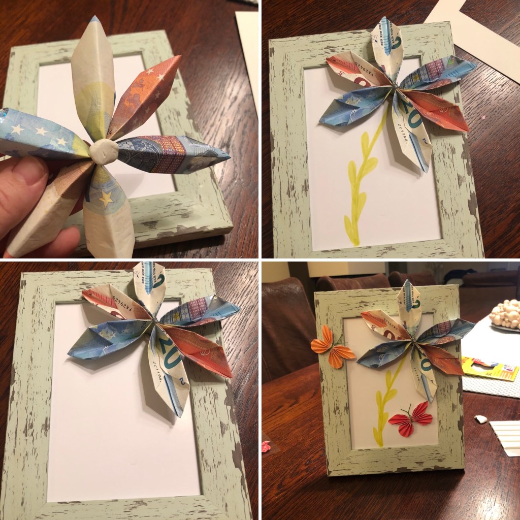 Als erstes habe ich den Bilderrahmen auseinander genommen und die Scheibe entfernt. Als Hintergrund habe ich das weiße Papier aus dem Bilderrahmen genommen und den Rahmen wieder zusammengesetzt. Dann habe ich die drei Scheine als Blütenblätter gefaltet. Als Anleitung habe ich für Euch eine Fotocollage erstellt.