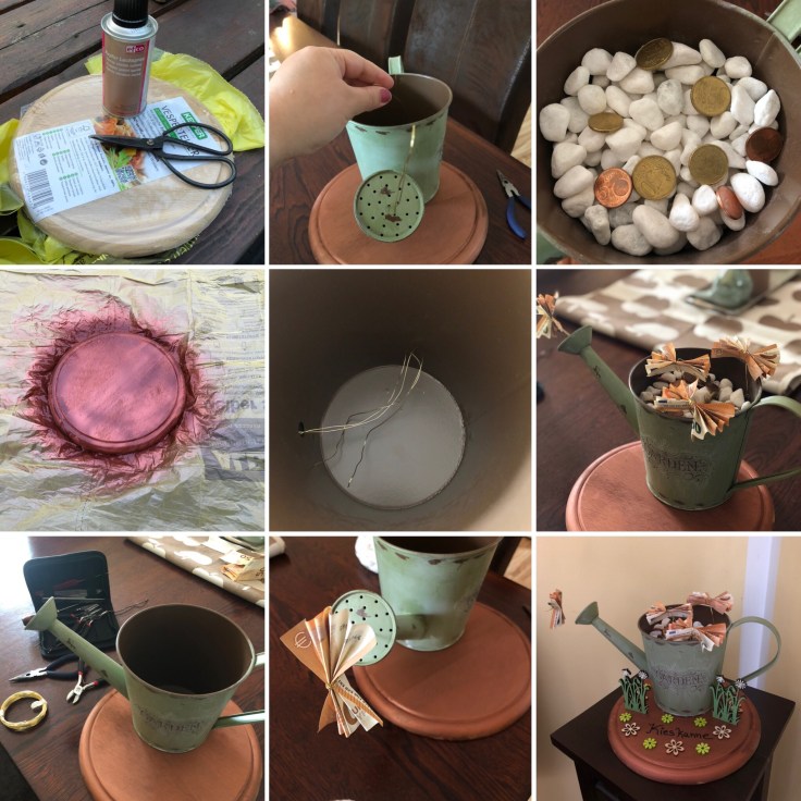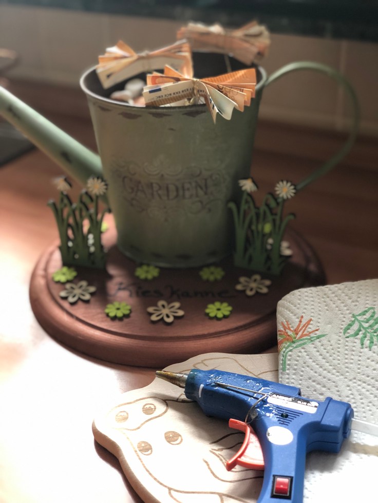 Ich habe die kleine Gießkanne und das Holzbrett im Kaufland für einen schmalen Taler erstanden. Das Holzbrett habe ich ein Tag vorher mit Sprühlack in Kupfer eingesprüht und trocknen lassen. Am nächsten Tag habe ich dann mit basteln angefangen. Ich habe die Geldscheine dekorativ gefaltet und einen Draht an den Scheinen befestigt. Ein Draht habe ich vorne durch ein „Gießloch“ gefädelt, dann habe ich die Kieselsteine in die Kanne gefüllt und dadurch den Draht befestigt. Die anderen Geldscheine habe ich mit den Draht in die Steine gesteckt und befestigt. Die Kanne habe ich mit Heißkleber auf dem Brett befestigt. Dann habe ich mit dem Permanent Marker „Kieskanne“ auf das Brett geschrieben. Nun habe ich noch alles mit Holzblüten (gekauft bei Pflanzenkölle) dekoriert. Diese habe ich auch mit der Heißklebepistole befestigt. Und fertig ist ein originelles Geldgeschenk.