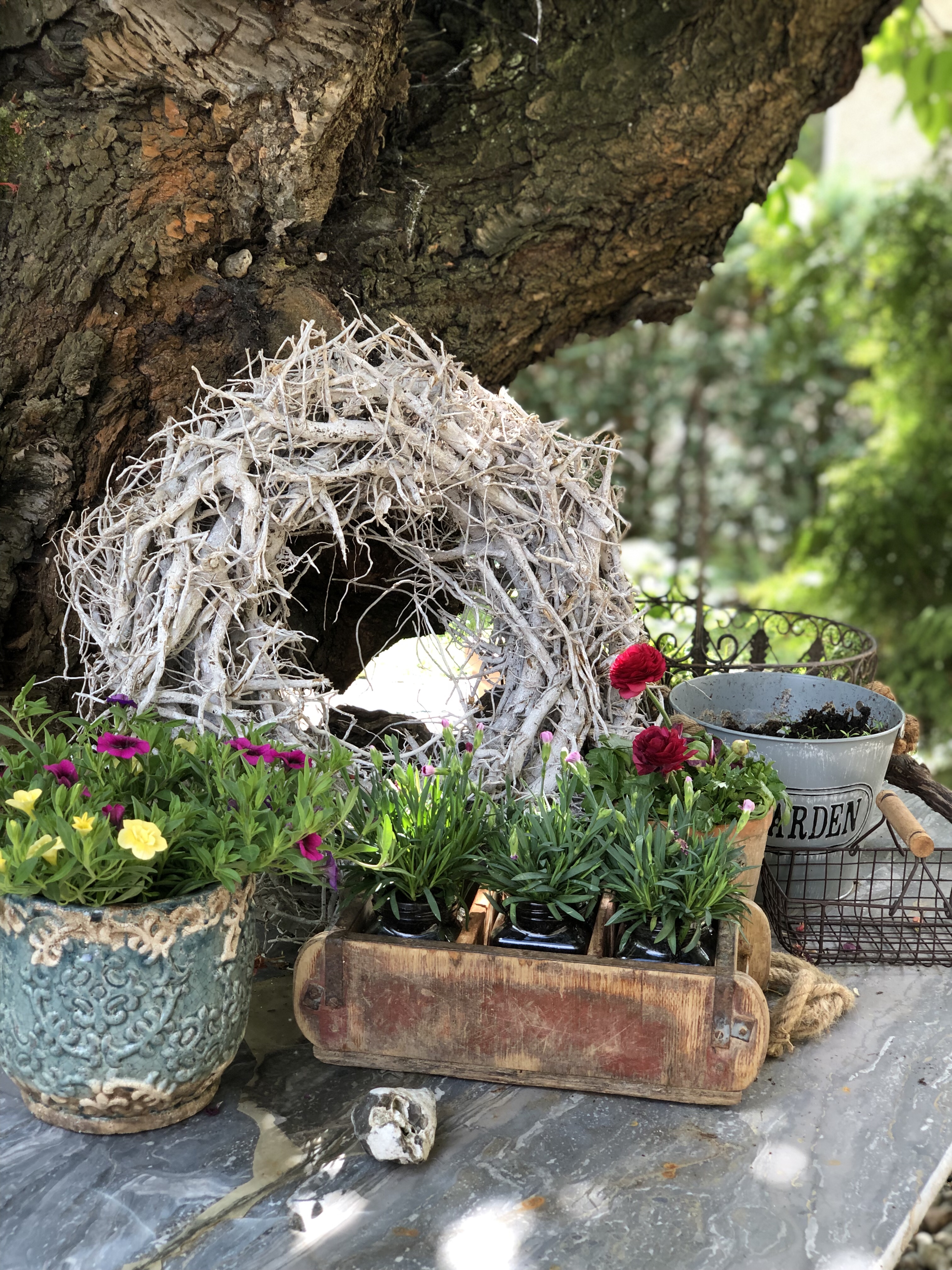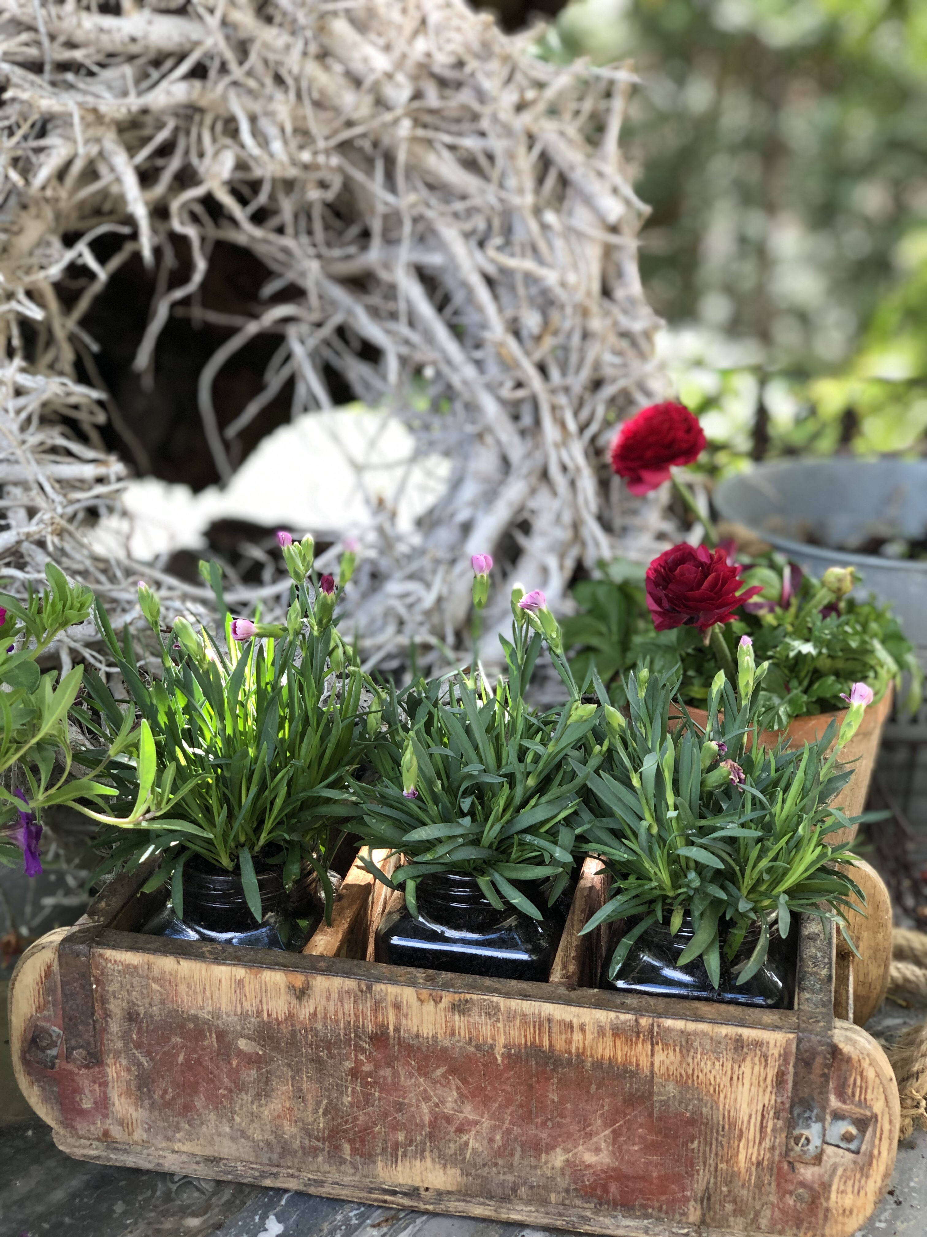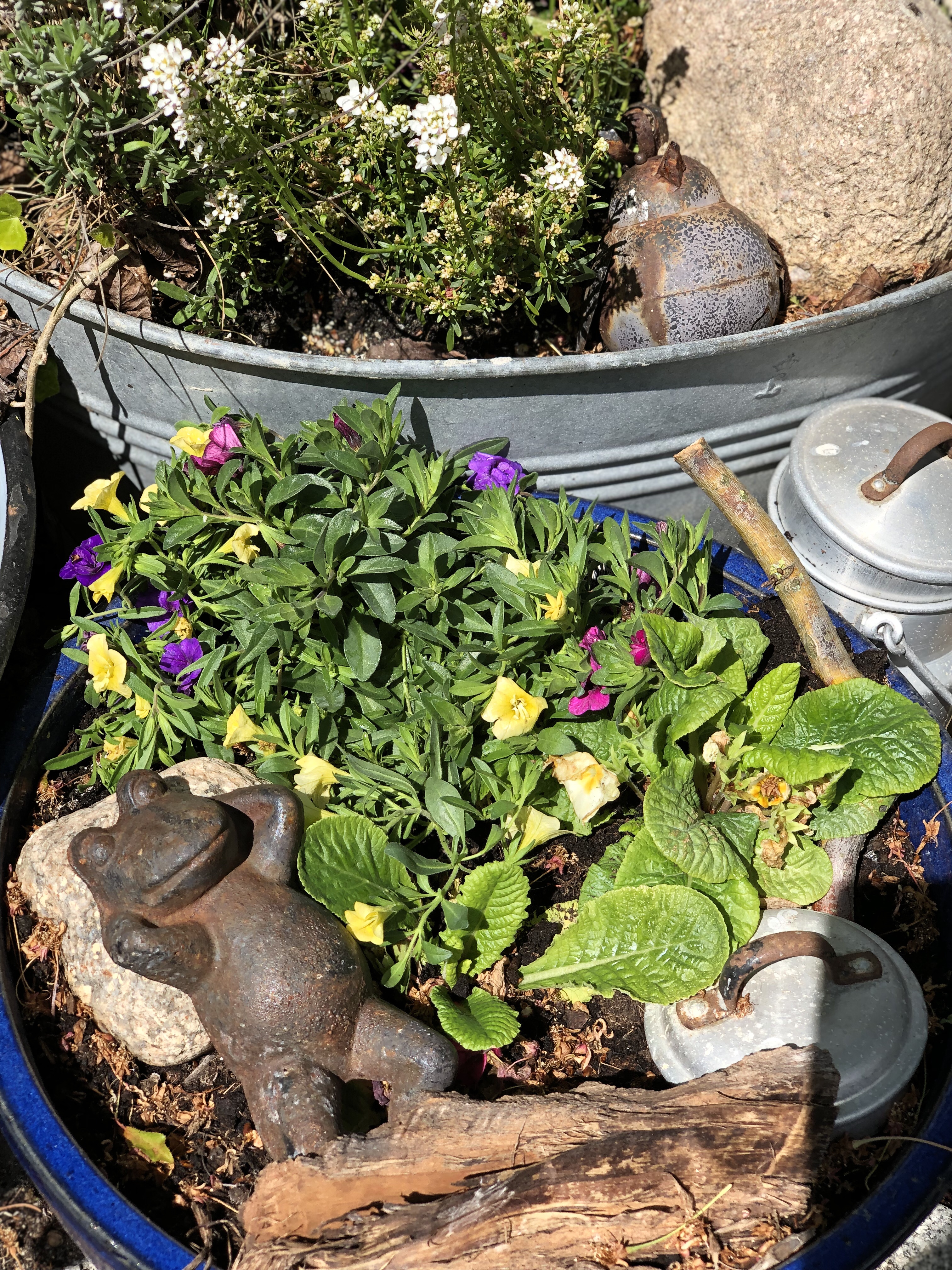 Da meine Frühjahrsbepflanzung mit Tausendschönchen und Ranunkeln noch so schön waren, habe ich diese mit nach hinten zu meinen Bepflanzungen gestellt.