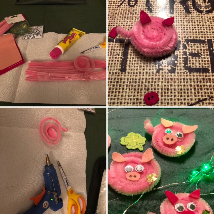 Ich habe einen Pfeifenreiniger zu einer Schnecke geformt und diese am Ende mit der Heißklebepistole fixiert. Ich habe allerdings ein kleines Ende für den Ringelschwanz des Schweines stehen lassen. Dann habe ich aus den Filz die Nase und die Ohren ausgeschnitten. Nun habe ich auch diese und die Wackelaugen mit der Klebepistole fixiert…… und so schnell ist ein kleines Glücksschwein fertig gestellt. Wenn man möchte kann man noch ein kleines Kleeblatt fixieren.