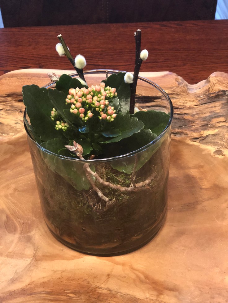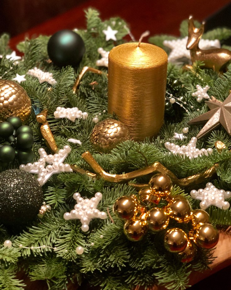 Nun habe ich die Tanne zurecht geschnitten und um die Kerzen gesteckt. Die Sukkulente habe ich in die Mitte von den vier Kerzen gelegt.