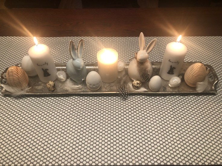 Als erstes habe ich auf den Tablett die 4 Kerzenhalter (von Depot) mit der Klebepistole befestigt. Das Tablett habe ich dann mit wieder ablösbaren Patex auf der Schale fixiert.