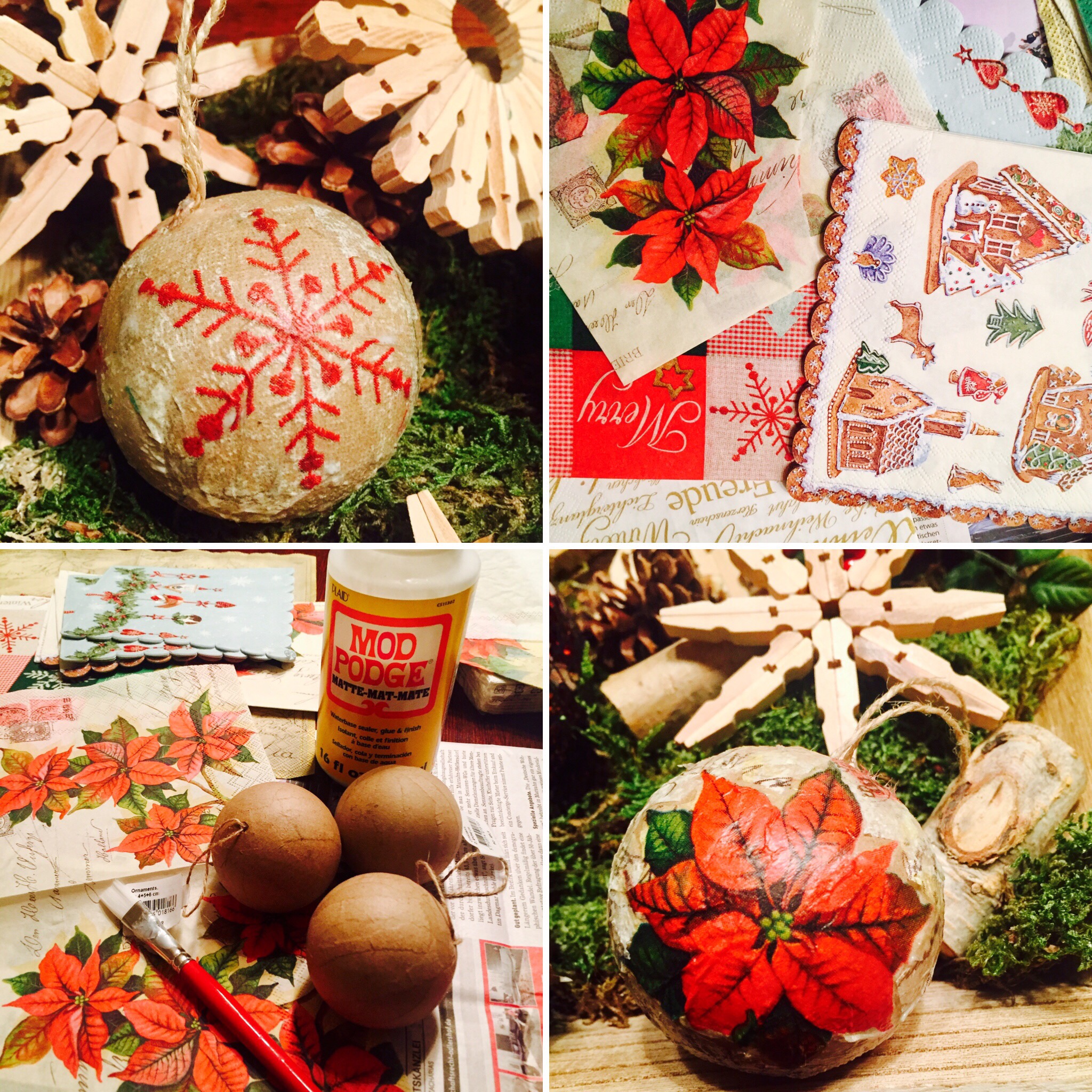 Heute nach Feierabend musste ich noch in die Apotheke um was gegen meine Erkältung zu besorgen. In dem Center wo sich meine Apotheke befindet ist im Kellergeschoss ein kleiner Bastelladen. Dieser zieht mich magisch an. Also ich konnte nicht anders und musste hinein gehen. Und was strahlt mich dort an …. Weihnachtskugeln aus Pappmaché mit Serviettentechnik gestaltet. Da ich dieses Jahr mit meinen Mädels zusammen die Serviettentechnik für mich entdeckt habe, konnte ich nicht anders und musste mir das Zubehör für diese Bastelei kaufen. Serviettenkleber hatte ich noch zu Hause. Und was hilft am Besten gegen eine Erkältung, wenn man was schönes für sich macht 😊 Also habe ich natürlich gleich damit angefangen Weihnachtskugeln aus Pappmaché mit Serviettentechnik zu gestalten. Diese Technik ist sehr einfach und für jedermann durchführbar. Man nimmt eine Serviette und zieht die oberste Schicht mit dem Druck von der Serviette ab. Man schneidet das Motiv seiner Wahl aus. Man streicht nun in der Größe des Motives den jeweiligen Gegenstand (in meinem Fall die Weihnachtskugel) mit Serviettenkleber ein. Nun drückt man das Motiv leicht an dieser Stelle an. Danach streicht man das Motiv mit einen Pinsel und Serviettenkleber ein. Man läßt das ganze trocknen und fertig ist die Serviettentechnik.